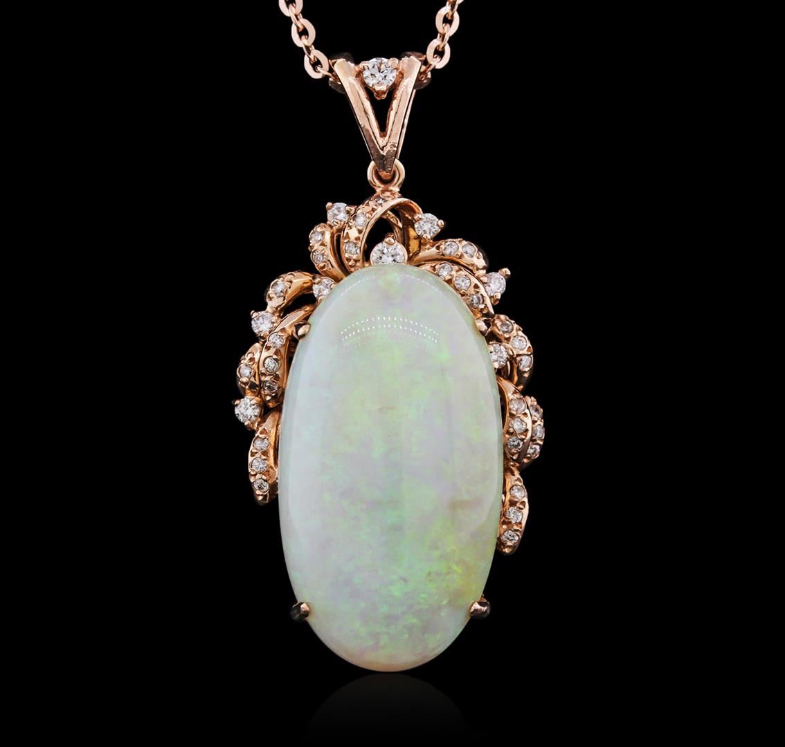 One electronically tested 14KT rose gold ladies cast opal and diamond pendant & chain 18.0" long, with a lobster claw clasp with a bright polish finish. Identified with markings of "14K". Condition is new. Containing: One white opal that is cut in a oval shaped cabochon and is prong set, measuring 29.00 mm long x 15.00 mm wide, and 7.20 mm thick and the approximate weight is 19.53 carats. The opal has a somewhat bright, green only play of color (fire) in a flashfire pattern; a medium dome; a good cut; no inclusions; slight variation in base in its brightness and pattern; and is somewhat directional. Thirty-Seven prong set round brilliant cut diamonds, measuring 2.50 - 1.30 x 1.14mm (depth est.) approximate total weight of 37 Stones = 0.30ct. Clarity: SI-1 to I-1. Color: I - J, Cut is Good. Colored gemstones are presumed to have been subjected to commonly used enhancement processes. All colored gemstones are graded in the mounting, unless otherwise stated. Total Weight of Diamonds 0.30ct. Total Weight of Opals 19.53ct. Total Weight of Pendant & Chain 14.70 grams. GGL Appraised at $4,275.00.