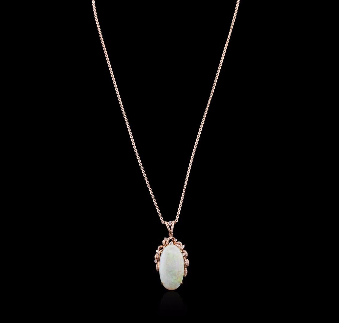 One electronically tested 14KT rose gold ladies cast opal and diamond pendant & chain 18.0" long, with a lobster claw clasp with a bright polish finish. Identified with markings of "14K". Condition is new. Containing: One white opal that is cut in a oval shaped cabochon and is prong set, measuring 29.00 mm long x 15.00 mm wide, and 7.20 mm thick and the approximate weight is 19.53 carats. The opal has a somewhat bright, green only play of color (fire) in a flashfire pattern; a medium dome; a good cut; no inclusions; slight variation in base in its brightness and pattern; and is somewhat directional. Thirty-Seven prong set round brilliant cut diamonds, measuring 2.50 - 1.30 x 1.14mm (depth est.) approximate total weight of 37 Stones = 0.30ct. Clarity: SI-1 to I-1. Color: I - J, Cut is Good. Colored gemstones are presumed to have been subjected to commonly used enhancement processes. All colored gemstones are graded in the mounting, unless otherwise stated. Total Weight of Diamonds 0.30ct. Total Weight of Opals 19.53ct. Total Weight of Pendant & Chain 14.70 grams. GGL Appraised at $4,275.00.