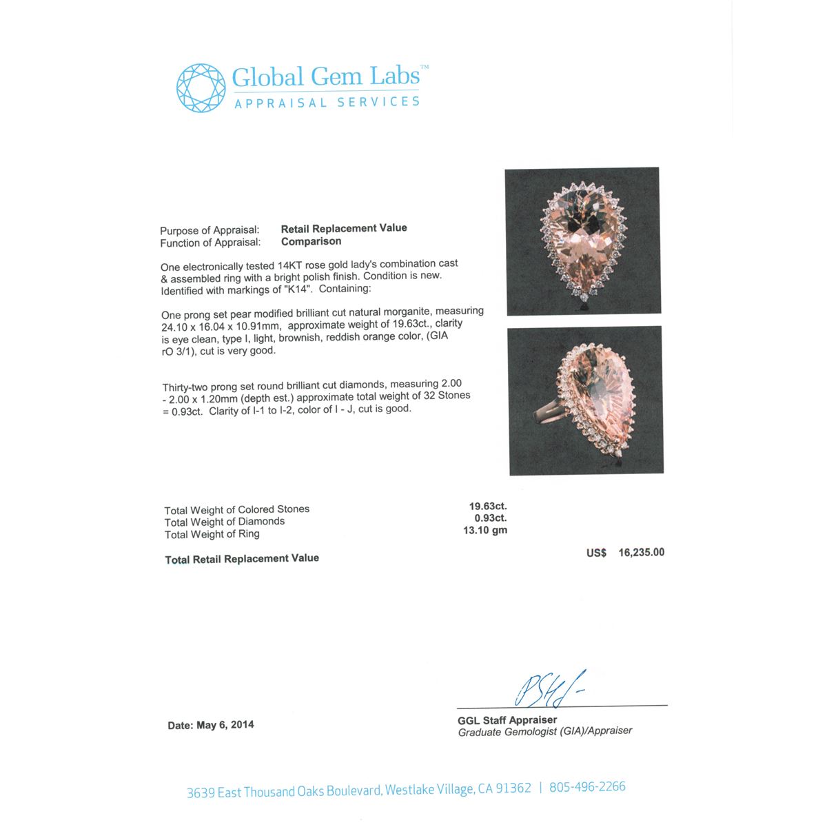 One electronically tested 14KT rose gold Ladies combination cast & assembled ring with a bright polish finish. Condition is new. Identified with markings of "K14". Containing: One prong set pear modified brilliant cut natural morganite, measuring 24.10 x 16.04 x 10.91mm, approximate weight of 19.63ct., clarity is eye clean, type I, light, brownish, reddish orange color, (GIA rO 3/1), cut is very good. GIA Report: 2151962601. Thirty-Two prong set round brilliant cut diamonds, measuring 2.00 - 2.00 x 1.20mm (depth est.) approximate. Total Weight of 32 Stones = 0.93ct. Clarity: I-1 to I-2. Color: I - J, Cut is Good. Total Weight of Colored Stones 19.63ct. Total Weight of Diamonds 0.93ct. Total Weight of Ring 13.10 grams. GGL Appraised at $16,235.00.