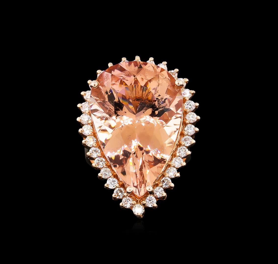 One electronically tested 14KT rose gold Ladies combination cast & assembled ring with a bright polish finish. Condition is new. Identified with markings of "K14". Containing: One prong set pear modified brilliant cut natural morganite, measuring 24.10 x 16.04 x 10.91mm, approximate weight of 19.63ct., clarity is eye clean, type I, light, brownish, reddish orange color, (GIA rO 3/1), cut is very good. GIA Report: 2151962601. Thirty-Two prong set round brilliant cut diamonds, measuring 2.00 - 2.00 x 1.20mm (depth est.) approximate. Total Weight of 32 Stones = 0.93ct. Clarity: I-1 to I-2. Color: I - J, Cut is Good. Total Weight of Colored Stones 19.63ct. Total Weight of Diamonds 0.93ct. Total Weight of Ring 13.10 grams. GGL Appraised at $16,235.00.