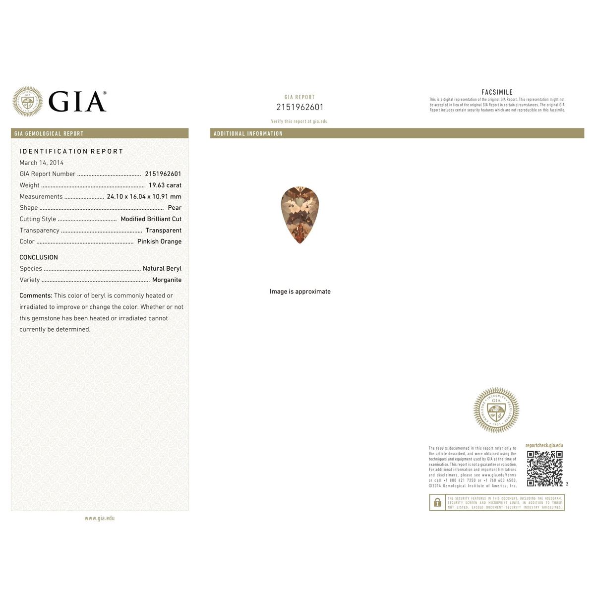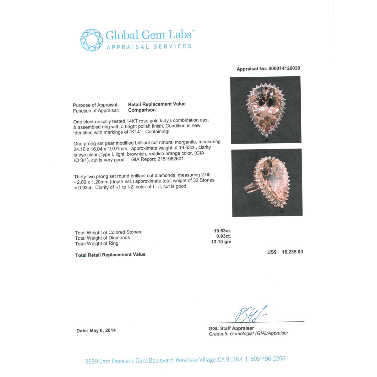 One electronically tested 14KT rose gold Ladies combination cast & assembled ring with a bright polish finish. Condition is new. Identified with markings of "K14". Containing: One prong set pear modified brilliant cut natural morganite, measuring 24.10 x 16.04 x 10.91mm, approximate weight of 19.63ct., clarity is eye clean, type I, light, brownish, reddish orange color, (GIA rO 3/1), cut is very good. GIA Report: 2151962601. Thirty-Two prong set round brilliant cut diamonds, measuring 2.00 - 2.00 x 1.20mm (depth est.) approximate. Total Weight of 32 Stones = 0.93ct. Clarity: I-1 to I-2. Color: I - J, Cut is Good. Total Weight of Colored Stones 19.63ct. Total Weight of Diamonds 0.93ct. Total Weight of Ring 13.10 grams. GGL Appraised at $16,235.00.