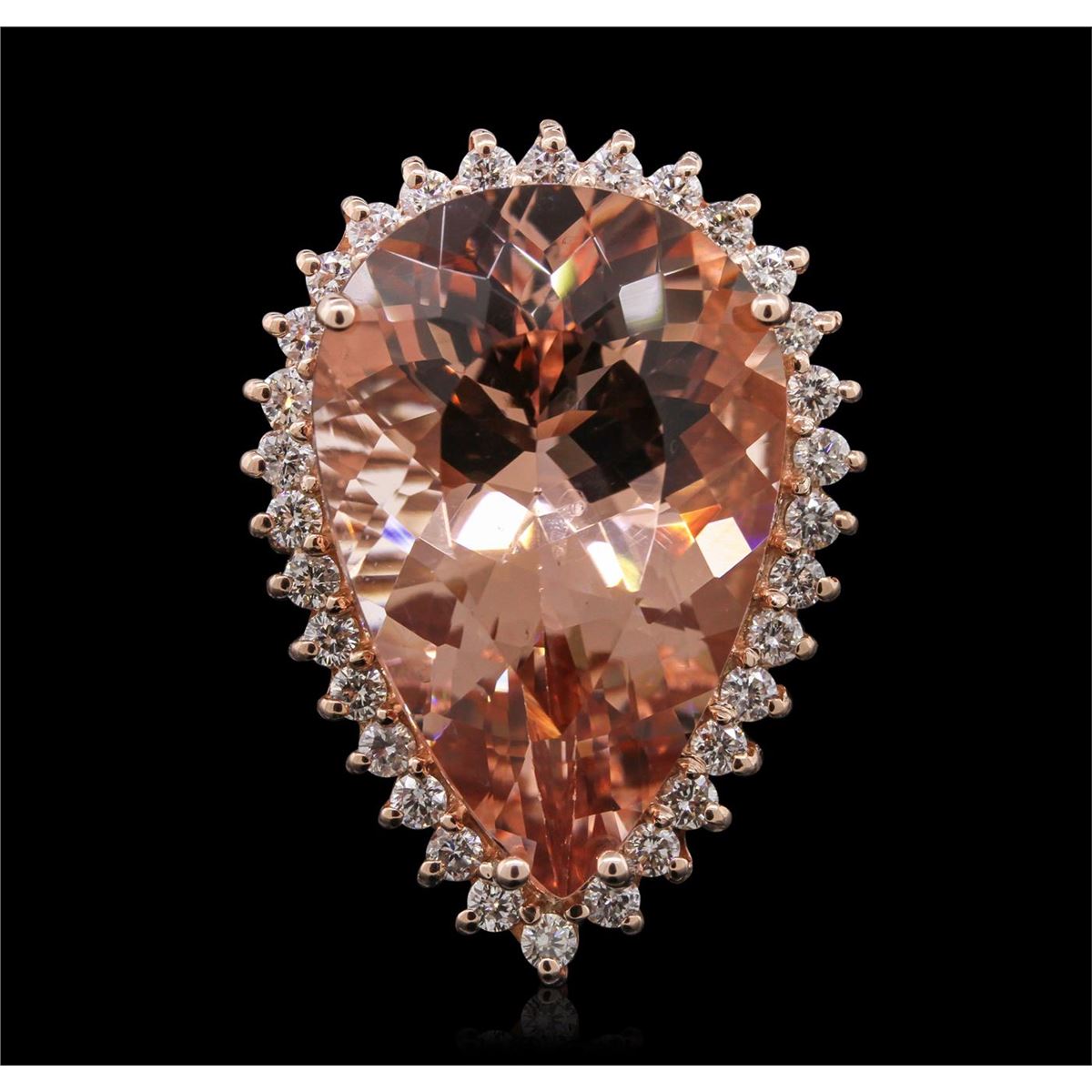One electronically tested 14KT rose gold Ladies combination cast & assembled ring with a bright polish finish. Condition is new. Identified with markings of "K14". Containing: One prong set pear modified brilliant cut natural morganite, measuring 24.10 x 16.04 x 10.91mm, approximate weight of 19.63ct., clarity is eye clean, type I, light, brownish, reddish orange color, (GIA rO 3/1), cut is very good. GIA Report: 2151962601. Thirty-Two prong set round brilliant cut diamonds, measuring 2.00 - 2.00 x 1.20mm (depth est.) approximate. Total Weight of 32 Stones = 0.93ct. Clarity: I-1 to I-2. Color: I - J, Cut is Good. Total Weight of Colored Stones 19.63ct. Total Weight of Diamonds 0.93ct. Total Weight of Ring 13.10 grams. GGL Appraised at $16,235.00.