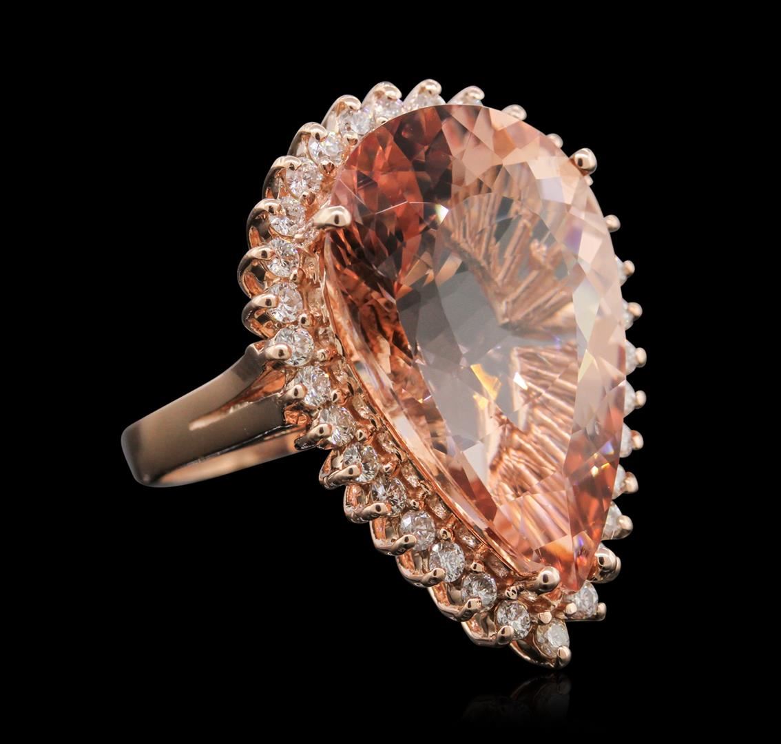 One electronically tested 14KT rose gold Ladies combination cast & assembled ring with a bright polish finish. Condition is new. Identified with markings of "K14". Containing: One prong set pear modified brilliant cut natural morganite, measuring 24.10 x 16.04 x 10.91mm, approximate weight of 19.63ct., clarity is eye clean, type I, light, brownish, reddish orange color, (GIA rO 3/1), cut is very good. GIA Report: 2151962601. Thirty-Two prong set round brilliant cut diamonds, measuring 2.00 - 2.00 x 1.20mm (depth est.) approximate. Total Weight of 32 Stones = 0.93ct. Clarity: I-1 to I-2. Color: I - J, Cut is Good. Total Weight of Colored Stones 19.63ct. Total Weight of Diamonds 0.93ct. Total Weight of Ring 13.10 grams. GGL Appraised at $16,235.00.