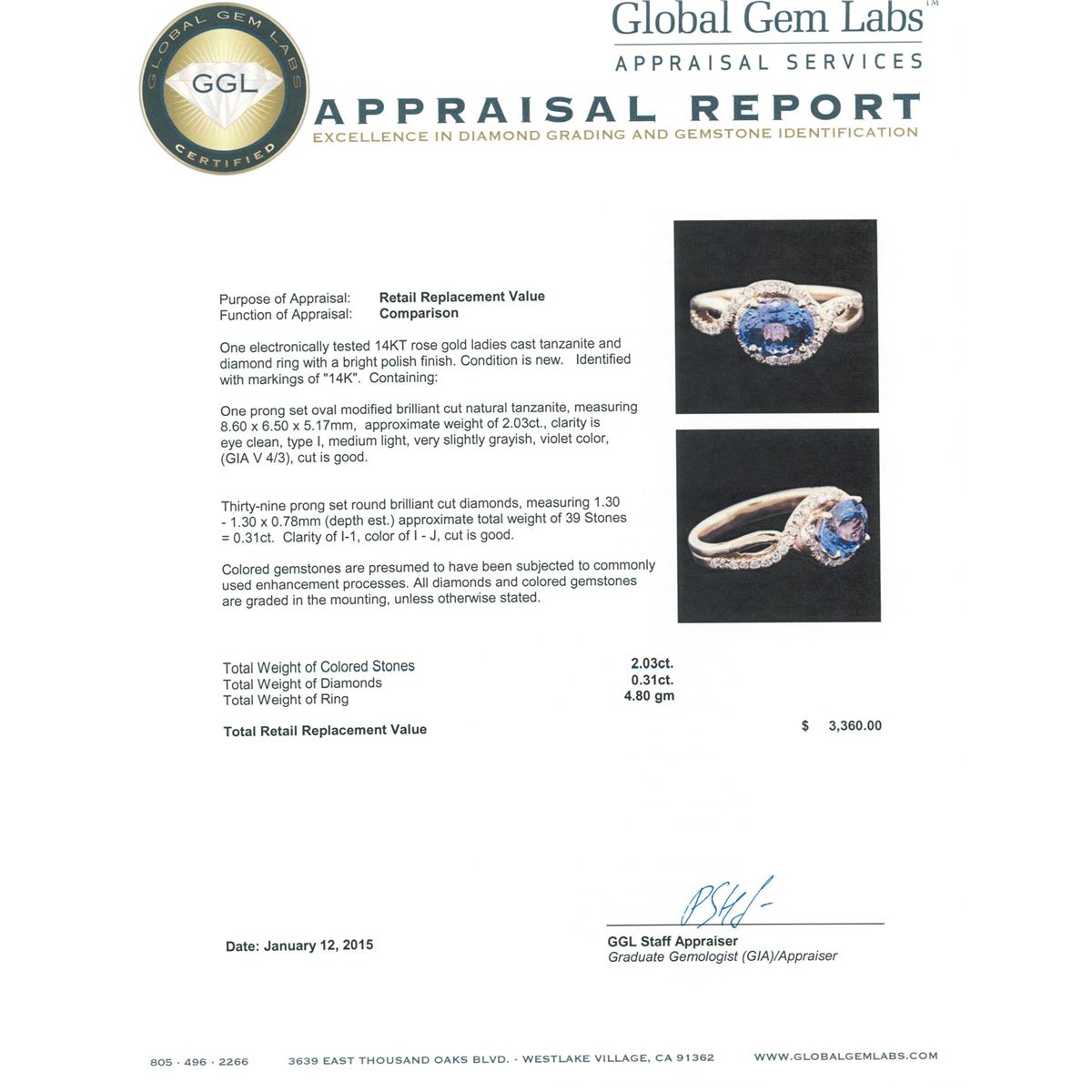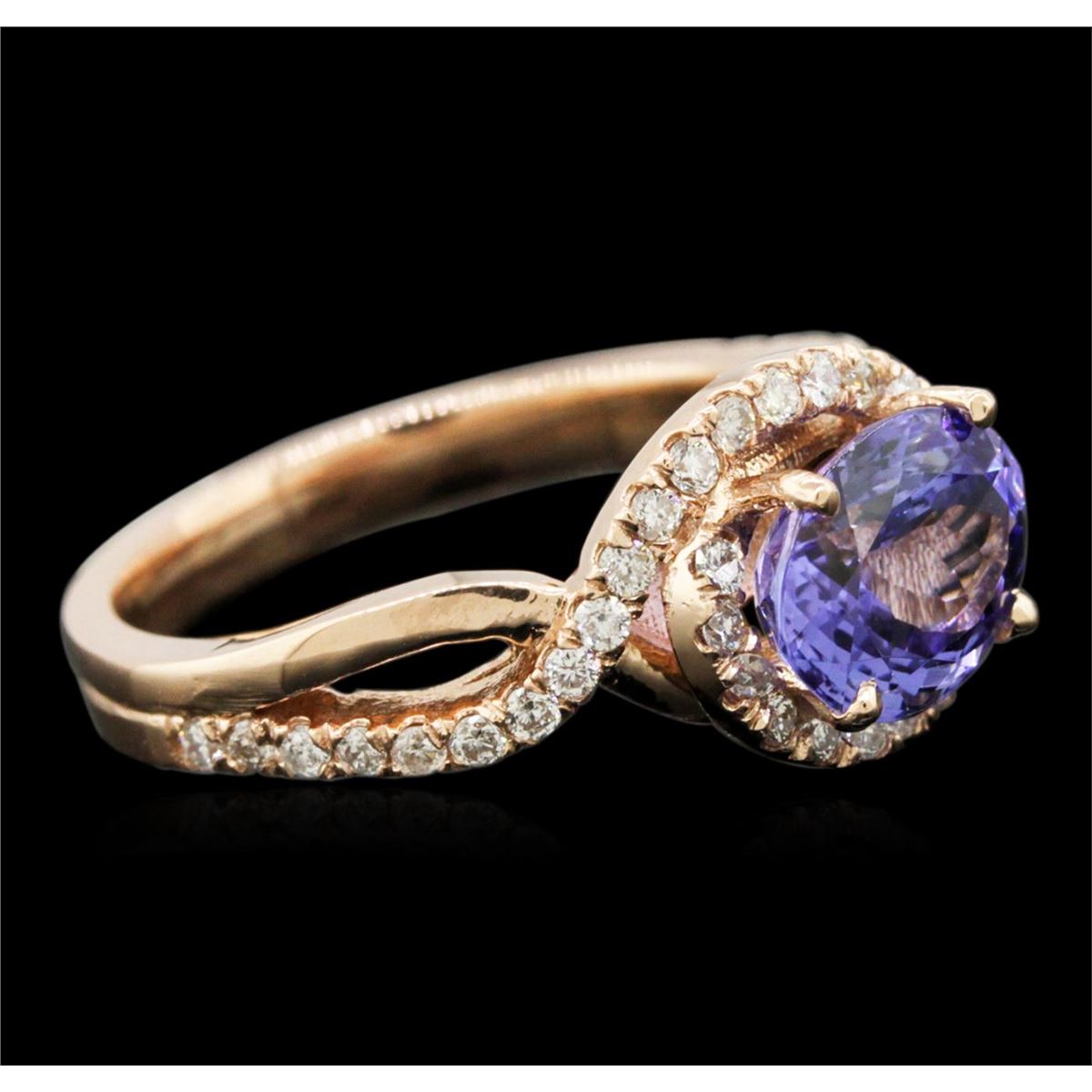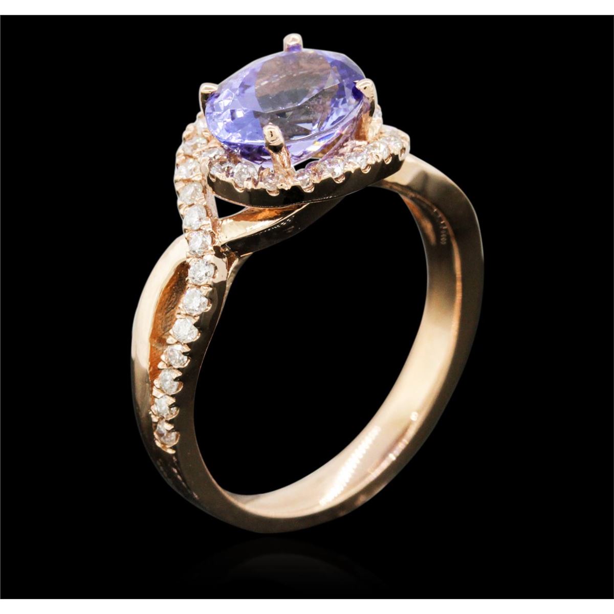 One electronically tested 14KT rose gold ladies cast tanzanite and diamond ring with a bright polish finish. Identified with markings of "14K". Condition is new. Containing: One prong set oval modified brilliant cut natural tanzanite, measuring 8.60 x 6.50 x 5.17mm, approximate weight of 2.03ct., clarity is eye clean, type I, medium light, very slightly grayish, violet color, (GIA V 4/3), cut is good. Thirty-Nine prong set round brilliant cut diamonds, measuring 1.30 - 1.30 x 0.78mm (depth est.) approximate total weight of 39 Stones = 0.31ct. Clarity: I-1. Color: I - J, Cut is Good. Colored gemstones are presumed to have been subjected to commonly used enhancement processes. All diamonds and colored gemstones are graded in the mounting, unless otherwise stated. Total Weight of Colored Stones 2.03ct. Total Weight of Diamonds 0.31ct. Total Weight of Ring 4.80 grams. GGL Appraised at $3,360.00.