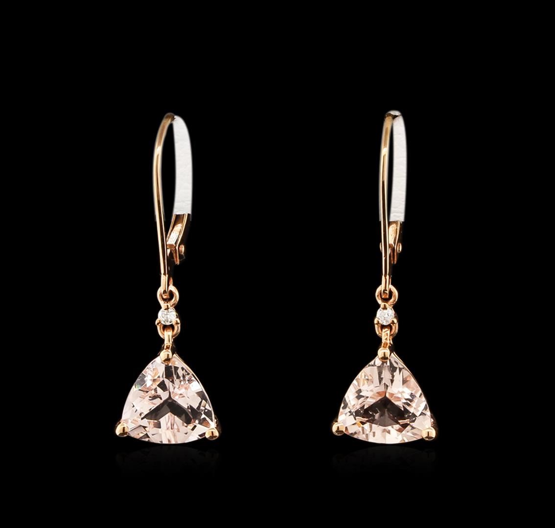 One pair of earrings featuring: 14KT rose gold weighing 1.18 grams containing two morganites with a total weight of 2.08ct and two round diamonds with a total weight of 0.02ct.