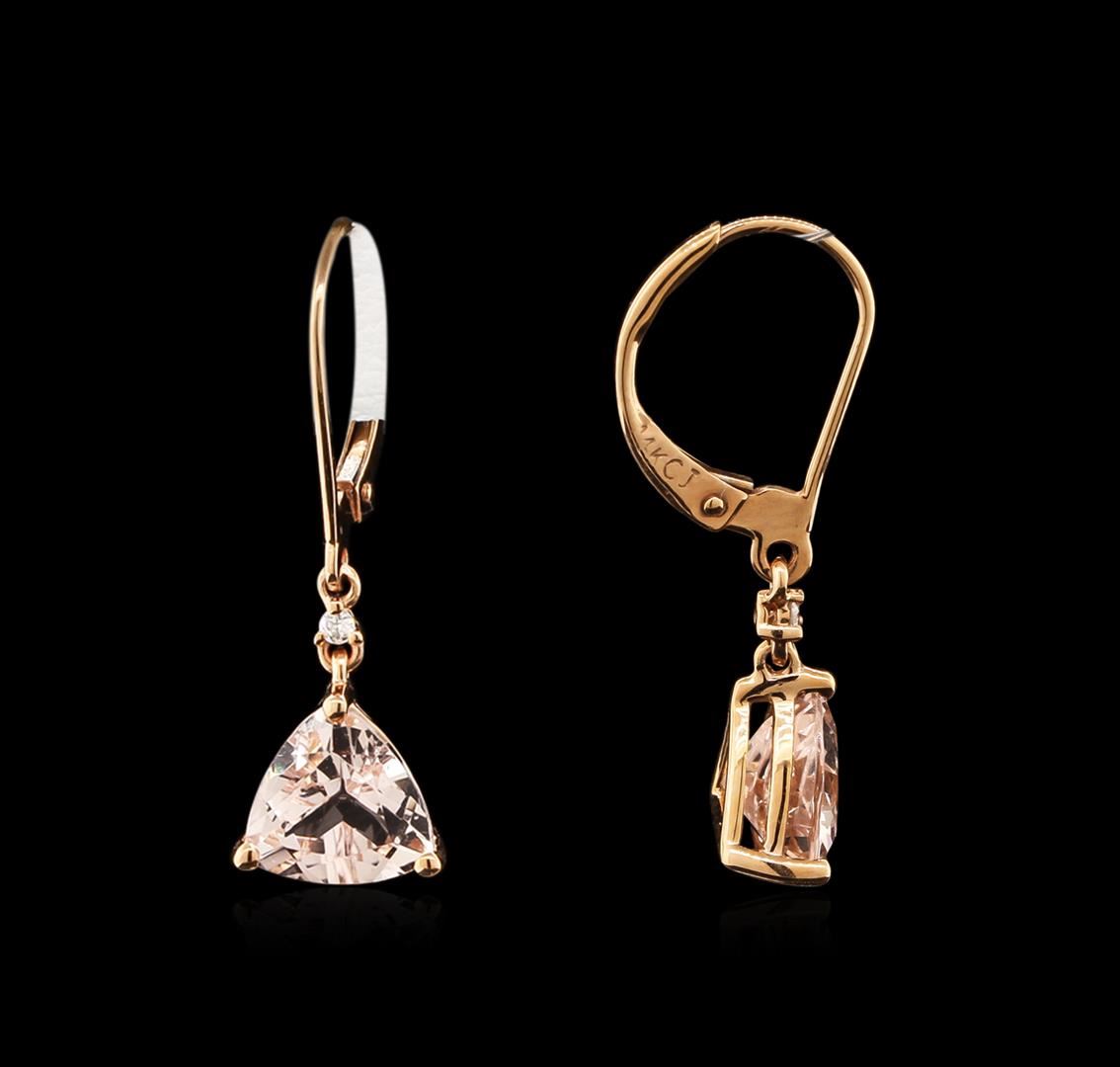 One pair of earrings featuring: 14KT rose gold weighing 1.18 grams containing two morganites with a total weight of 2.08ct and two round diamonds with a total weight of 0.02ct.