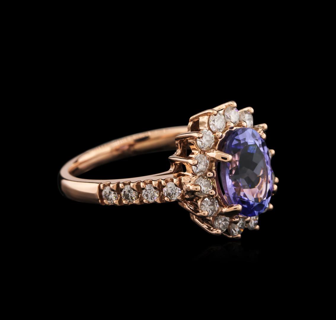 One electronically tested 14KT rose gold ladies cast tanzanite and diamond ring with a bright polish finish. Identified with markings of "14K". Condition is new. Containing: One prong set oval modified brilliant cut natural tanzanite, measuring 9.30 x 6.90 x 4.49mm, approximate weight of 2.15ct., clarity is eye clean, type I, medium light, very slightly grayish, violet color, (GIA V 4/3), cut is good. Twenty-Two prong set round brilliant cut diamonds, measuring 1.90 - 1.90 x 1.14mm (depth est.) approximate total weight of 22 Stones = 0.78ct. Clarity: SI-1 to SI-2. Color: I - J, Cut is Good. Colored gemstones are presumed to have been subjected to commonly used enhancement processes. All diamonds and colored gemstones are graded in the mounting, unless otherwise stated. Total Weight of Colored Stones 2.15ct. Total Weight of Diamonds 0.78ct. Total Weight of Ring 4.60 grams. GGL Appraised.