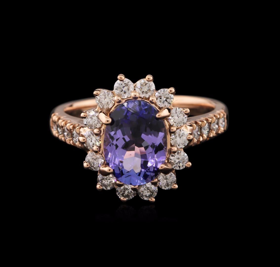 One electronically tested 14KT rose gold ladies cast tanzanite and diamond ring with a bright polish finish. Identified with markings of "14K". Condition is new. Containing: One prong set oval modified brilliant cut natural tanzanite, measuring 9.30 x 6.90 x 4.49mm, approximate weight of 2.15ct., clarity is eye clean, type I, medium light, very slightly grayish, violet color, (GIA V 4/3), cut is good. Twenty-Two prong set round brilliant cut diamonds, measuring 1.90 - 1.90 x 1.14mm (depth est.) approximate total weight of 22 Stones = 0.78ct. Clarity: SI-1 to SI-2. Color: I - J, Cut is Good. Colored gemstones are presumed to have been subjected to commonly used enhancement processes. All diamonds and colored gemstones are graded in the mounting, unless otherwise stated. Total Weight of Colored Stones 2.15ct. Total Weight of Diamonds 0.78ct. Total Weight of Ring 4.60 grams. GGL Appraised at $3,435.00.
