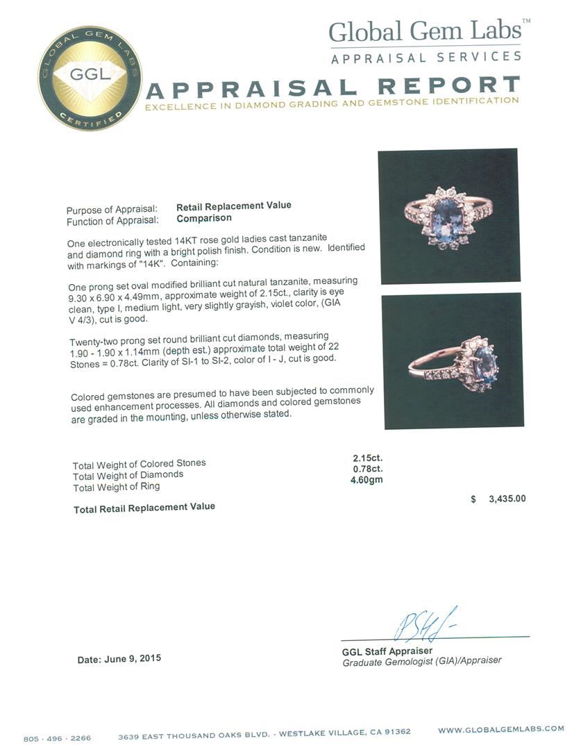 One electronically tested 14KT rose gold ladies cast tanzanite and diamond ring with a bright polish finish. Identified with markings of "14K". Condition is new. Containing: One prong set oval modified brilliant cut natural tanzanite, measuring 9.30 x 6.90 x 4.49mm, approximate weight of 2.15ct., clarity is eye clean, type I, medium light, very slightly grayish, violet color, (GIA V 4/3), cut is good. Twenty-Two prong set round brilliant cut diamonds, measuring 1.90 - 1.90 x 1.14mm (depth est.) approximate total weight of 22 Stones = 0.78ct. Clarity: SI-1 to SI-2. Color: I - J, Cut is Good. Colored gemstones are presumed to have been subjected to commonly used enhancement processes. All diamonds and colored gemstones are graded in the mounting, unless otherwise stated. Total Weight of Colored Stones 2.15ct. Total Weight of Diamonds 0.78ct. Total Weight of Ring 4.60 grams. GGL Appraised at $3,435.00.