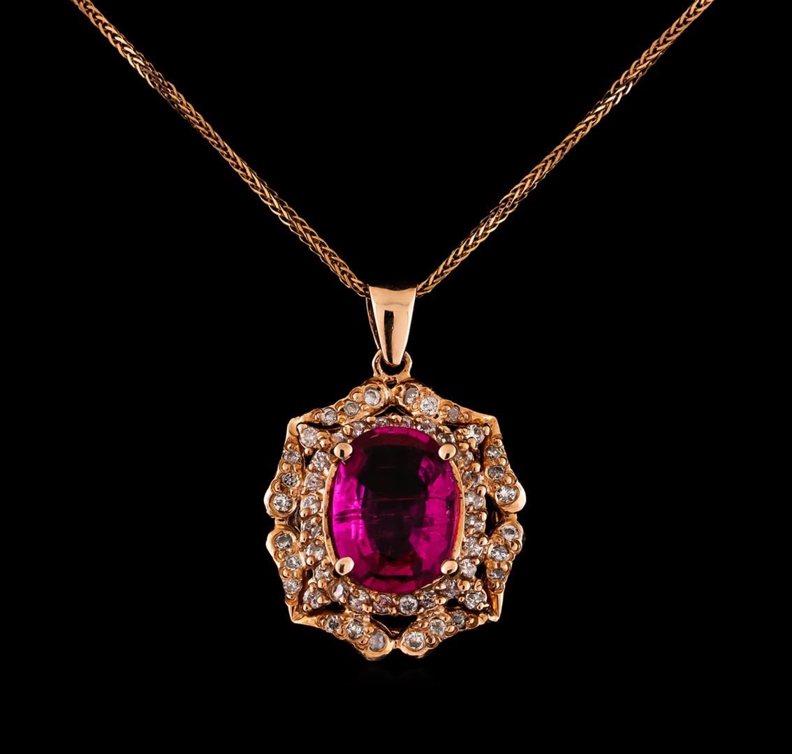 One electronically tested 14KT rose gold ladies combination cast & assembled pendant & chain 17.0" long, small cable link with a lobster claw clasp with a bright polish finish. Condition is new. Identified with markings of "14K". Containing: Fifty-Three prong set round brilliant cut diamonds, measuring 1.30 - 1.30 x 0.78mm (depth est.) approximate. Total Weight of 53 Stones = 0.42ct. Clarity: I-1 to I-2. Color: I - J, Cut is Good. One prong set oval modified brilliant cut natural pink tourmaline, measuring 10.12 x 8.36 x 4.30mm, approximate weight of 2.25ct., clarity is moderately included, type II, medium, moderately strong, reddish purple color, (GIA rP 5/4), cut is good. Colored gemstones are presumed to have been subjected to commonly used enhancement processes. All diamonds and colored gemstones are graded in the mounting, unless otherwise stated. Total Weight of Colored Stones 2.25ct. Total Weight of Diamonds 0.42ct. Total Weight of Pendant & Chain 6.60 grams. GGL Appraised at $4,295.00.