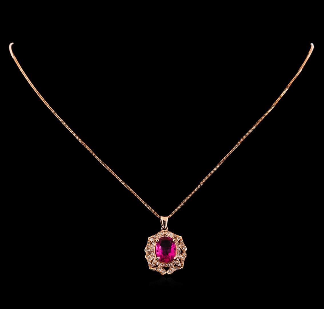 One electronically tested 14KT rose gold ladies combination cast & assembled pendant & chain 17.0" long, small cable link with a lobster claw clasp with a bright polish finish. Condition is new. Identified with markings of "14K". Containing: Fifty-Three prong set round brilliant cut diamonds, measuring 1.30 - 1.30 x 0.78mm (depth est.) approximate. Total Weight of 53 Stones = 0.42ct. Clarity: I-1 to I-2. Color: I - J, Cut is Good. One prong set oval modified brilliant cut natural pink tourmaline, measuring 10.12 x 8.36 x 4.30mm, approximate weight of 2.25ct., clarity is moderately included, type II, medium, moderately strong, reddish purple color, (GIA rP 5/4), cut is good. Colored gemstones are presumed to have been subjected to commonly used enhancement processes. All diamonds and colored gemstones are graded in the mounting, unless otherwise stated. Total Weight of Colored Stones 2.25ct. Total Weight of Diamonds 0.42ct. Total Weight of Pendant & Chain 6.60 grams. GGL Appraised at $4,295.00.