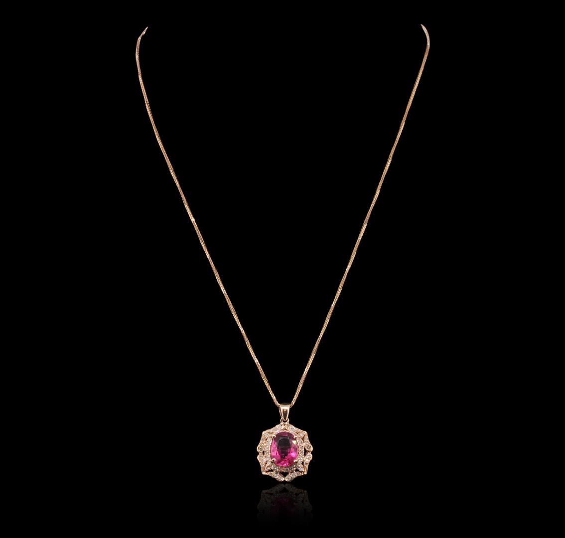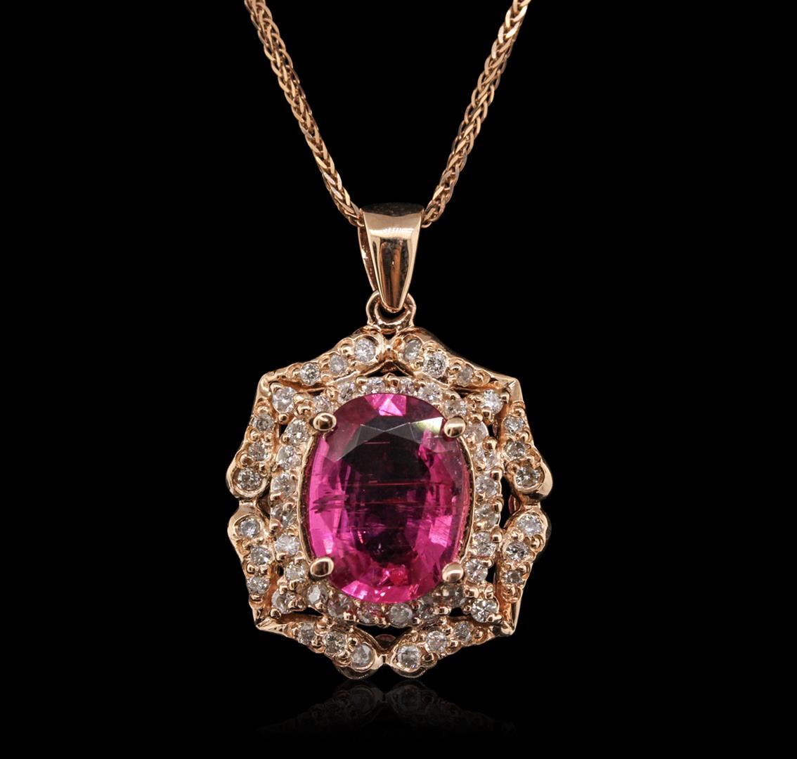 One electronically tested 14KT rose gold ladies combination cast & assembled pendant & chain 17.0" long, small cable link with a lobster claw clasp with a bright polish finish. Condition is new. Identified with markings of "14K". Containing: Fifty-Three prong set round brilliant cut diamonds, measuring 1.30 - 1.30 x 0.78mm (depth est.) approximate. Total Weight of 53 Stones = 0.42ct. Clarity: I-1 to I-2. Color: I - J, Cut is Good. One prong set oval modified brilliant cut natural pink tourmaline, measuring 10.12 x 8.36 x 4.30mm, approximate weight of 2.25ct., clarity is moderately included, type II, medium, moderately strong, reddish purple color, (GIA rP 5/4), cut is good. Colored gemstones are presumed to have been subjected to commonly used enhancement processes. All diamonds and colored gemstones are graded in the mounting, unless otherwise stated. Total Weight of Colored Stones 2.25ct. Total Weight of Diamonds 0.42ct. Total Weight of Pendant & Chain 6.60 grams. GGL Appraised at $4,295.00.