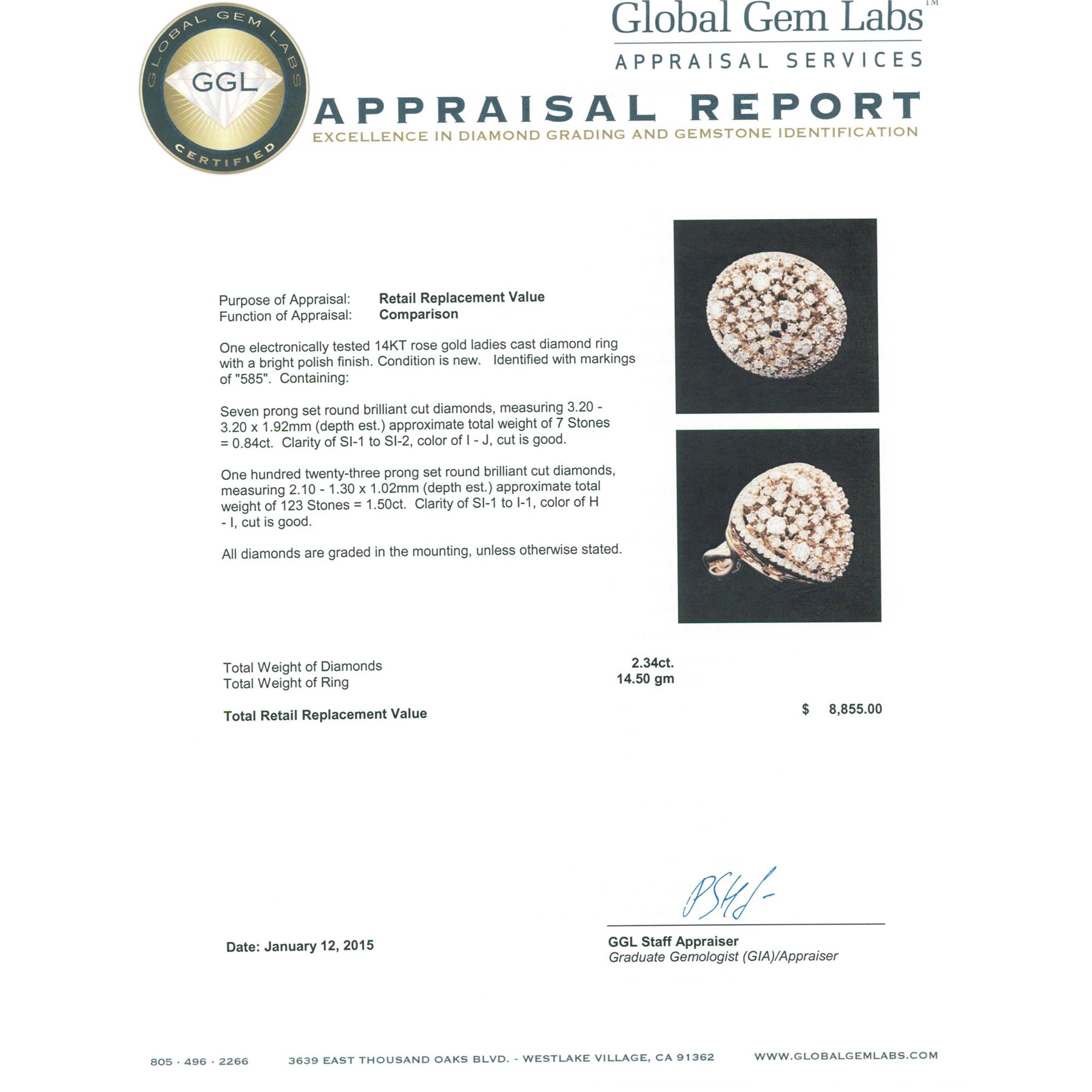One electronically tested 14KT rose gold ladies cast diamond ring with a bright polish finish. Identified with markings of "585". Condition is new. Containing: Seven prong set round brilliant cut diamonds, measuring 3.20 - 3.20 x 1.92mm (depth est.) approximate total weight of 7 Stones = 0.84ct. Clarity: SI-1 to SI-2. Color: I - J, Cut is Good. One Hundred Twenty-Three prong set round brilliant cut diamonds, measuring 2.10 - 1.30 x 1.02mm (depth est.) approximate total weight of 123 Stones = 1.50ct. Clarity: SI-1 to I-1. Color: H - I, Cut is Good. All diamonds are graded in the mounting, unless otherwise stated. Total Weight of Diamonds 2.34ct. Total Weight of Ring 14.50 grams. GGL Appraised at $8,855.00.