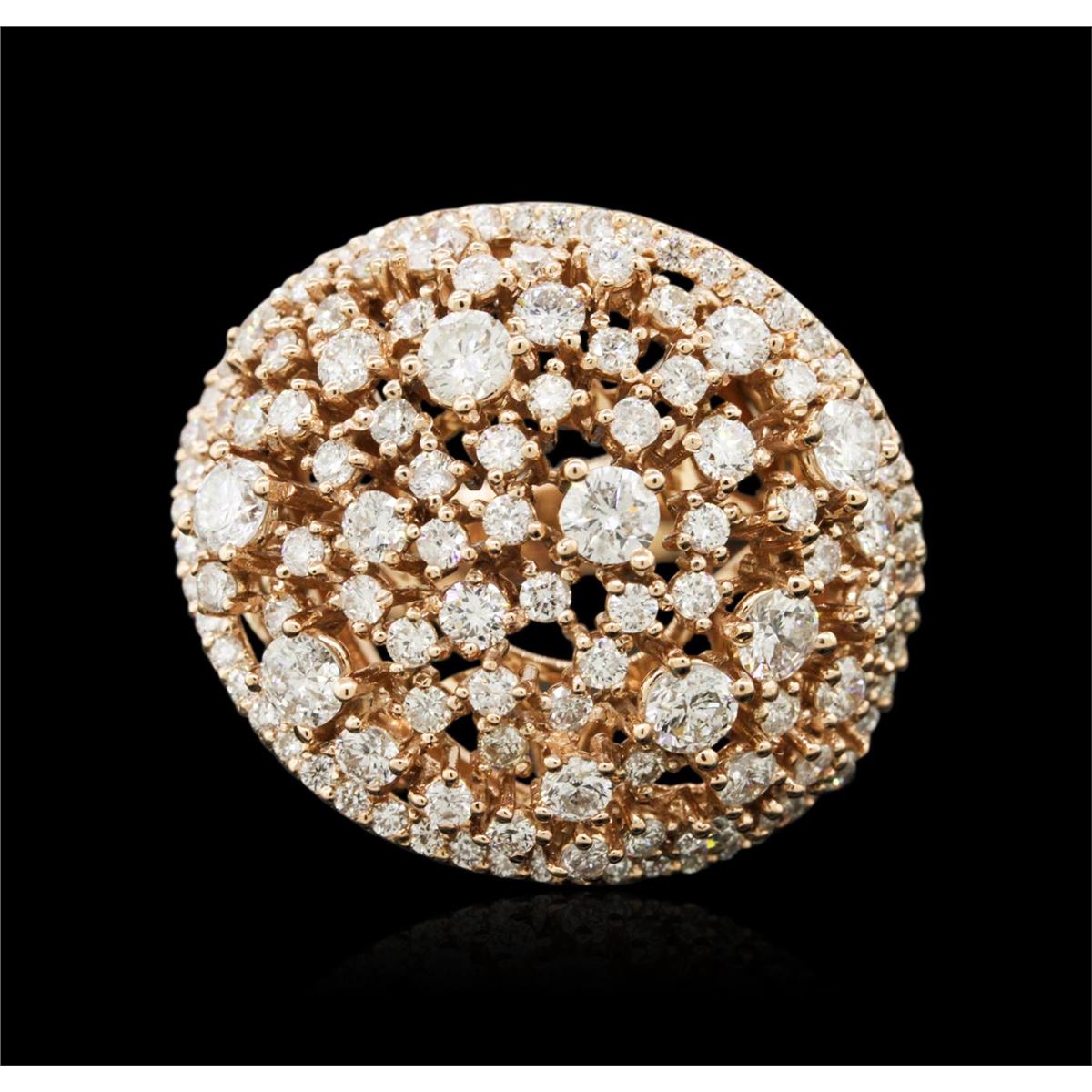 One electronically tested 14KT rose gold ladies cast diamond ring with a bright polish finish. Identified with markings of "585". Condition is new. Containing: Seven prong set round brilliant cut diamonds, measuring 3.20 - 3.20 x 1.92mm (depth est.) approximate total weight of 7 Stones = 0.84ct. Clarity: SI-1 to SI-2. Color: I - J, Cut is Good. One Hundred Twenty-Three prong set round brilliant cut diamonds, measuring 2.10 - 1.30 x 1.02mm (depth est.) approximate total weight of 123 Stones = 1.50ct. Clarity: SI-1 to I-1. Color: H - I, Cut is Good. All diamonds are graded in the mounting, unless otherwise stated. Total Weight of Diamonds 2.34ct. Total Weight of Ring 14.50 grams. GGL Appraised at $8,855.00.