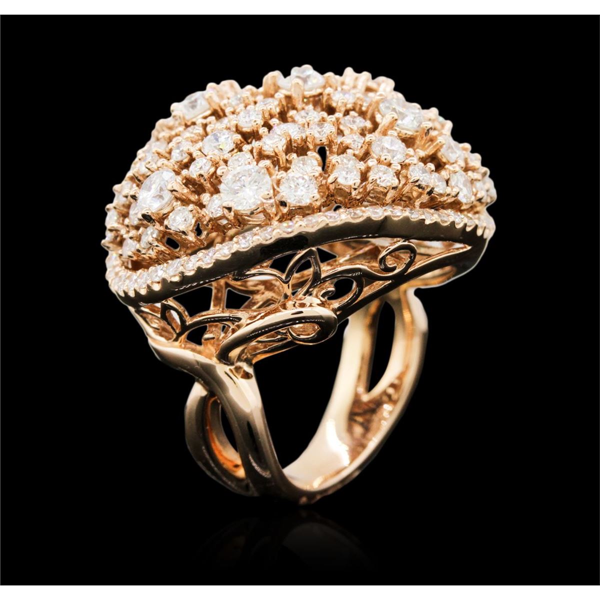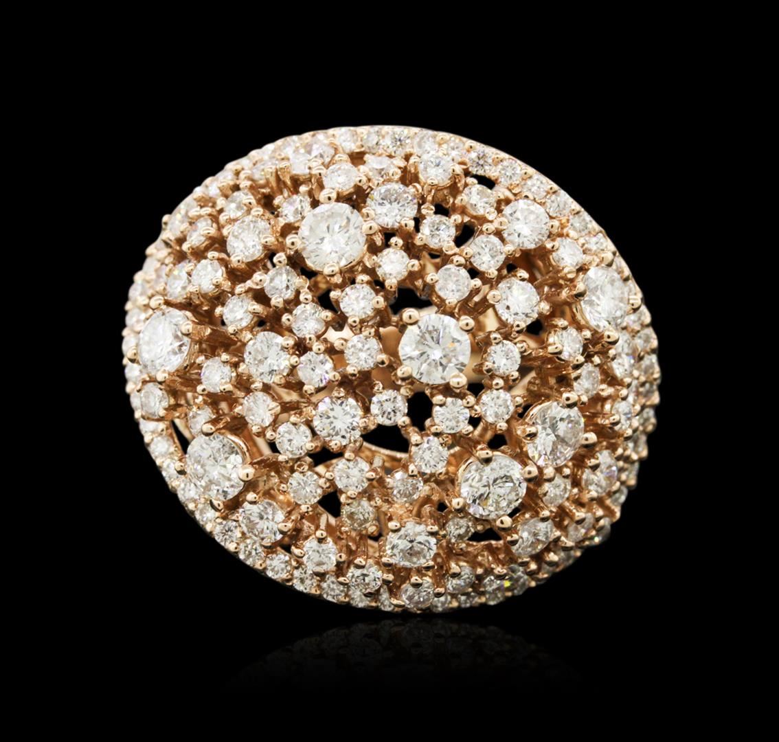 One electronically tested 14KT rose gold ladies cast diamond ring with a bright polish finish. Identified with markings of "585". Condition is new. Containing: Seven prong set round brilliant cut diamonds, measuring 3.20 - 3.20 x 1.92mm (depth est.) approximate total weight of 7 Stones = 0.84ct. Clarity: SI-1 to SI-2. Color: I - J, Cut is Good. One Hundred Twenty-Three prong set round brilliant cut diamonds, measuring 2.10 - 1.30 x 1.02mm (depth est.) approximate total weight of 123 Stones = 1.50ct. Clarity: SI-1 to I-1. Color: H - I, Cut is Good. All diamonds are graded in the mounting, unless otherwise stated. Total Weight of Diamonds 2.34ct. Total Weight of Ring 14.50 grams. GGL Appraised at $8,855.00.