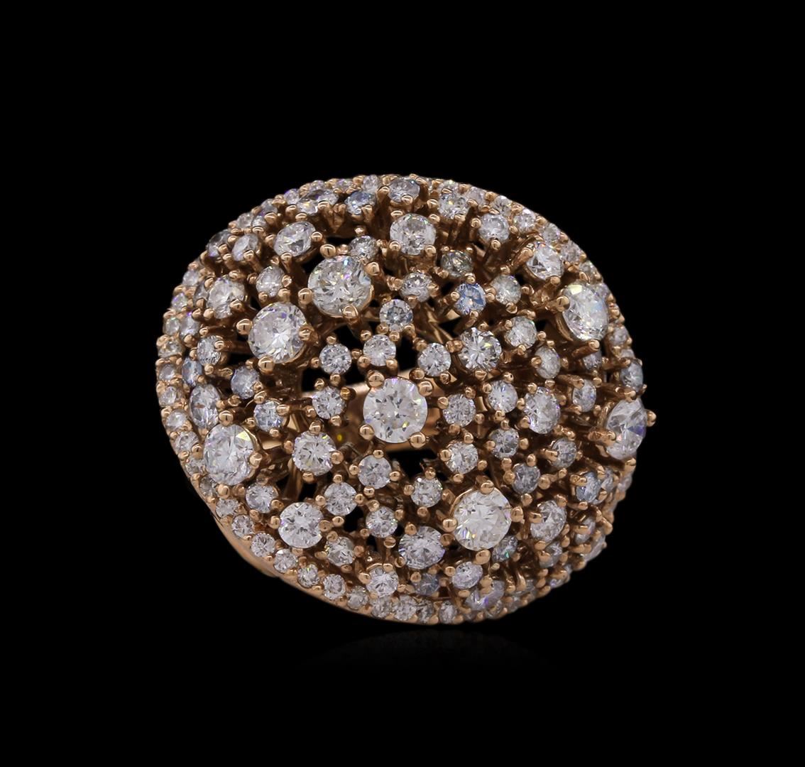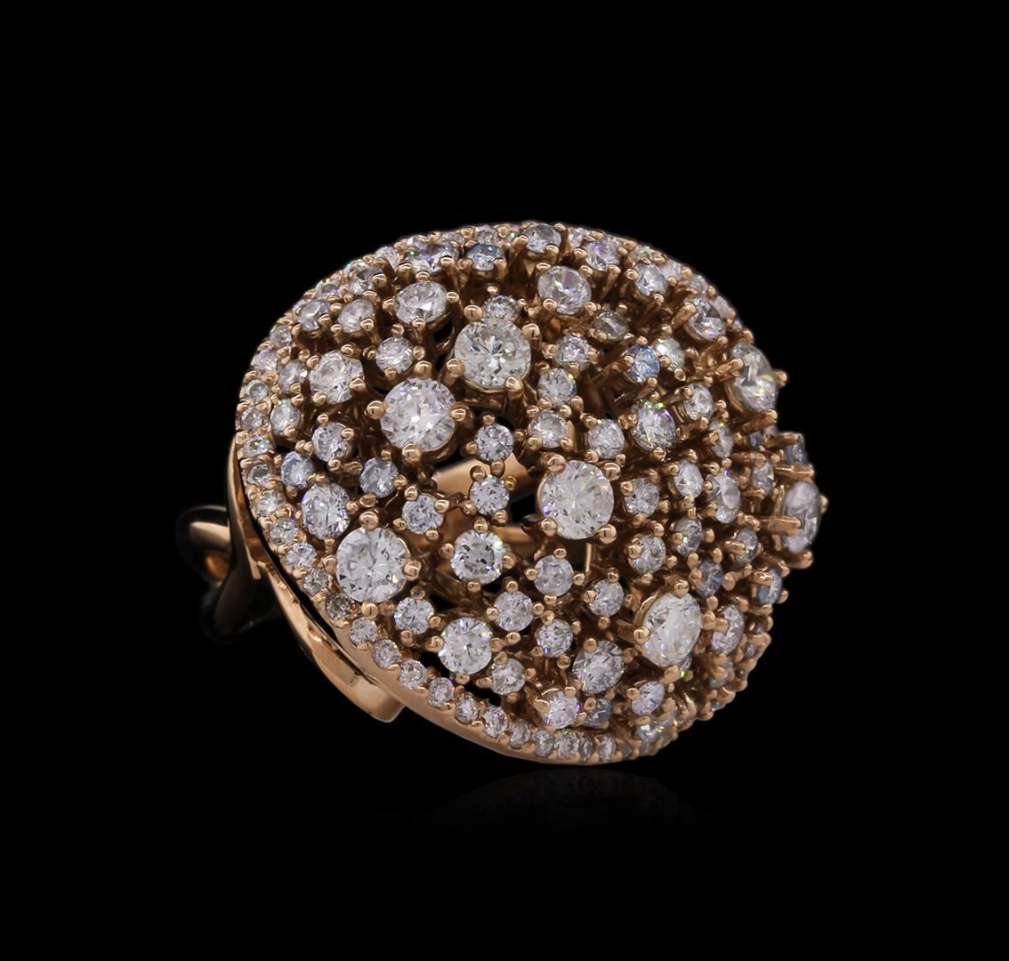 One electronically tested 14KT rose gold ladies cast diamond ring with a bright polish finish. Identified with markings of "585". Condition is new. Containing: Seven prong set round brilliant cut diamonds, measuring 3.20 - 3.20 x 1.92mm (depth est.) approximate total weight of 7 Stones = 0.84ct. Clarity: SI-1 to SI-2. Color: I - J, Cut is Good. One Hundred Twenty-Three prong set round brilliant cut diamonds, measuring 2.10 - 1.30 x 1.02mm (depth est.) approximate total weight of 123 Stones = 1.50ct. Clarity: SI-1 to I-1. Color: H - I, Cut is Good. All diamonds are graded in the mounting, unless otherwise stated. Total Weight of Diamonds 2.34ct. Total Weight of Ring 14.50 grams. GGL Appraised at $8,855.00.