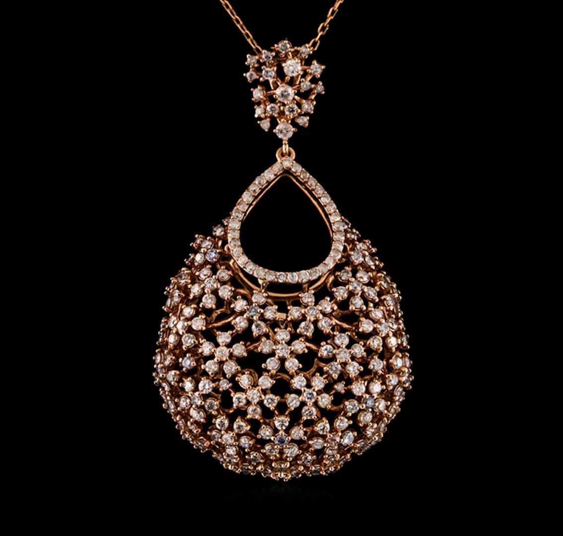 One electronically tested 14KT rose gold ladies combination cast & assembled pendant & chain 16.5" long, medium cable link with a spring ring clasp with a bright polish finish. Condition is new. Identified with markings of "14K". Containing: Two Hundred Thirty-Six prong set round brilliant cut diamonds, measuring 1.50 - 1.30 x 0.84mm (depth est.) approximate total weight of 236 Stones = 2.36ct. Clarity: I-1 to I-3. Color: I - J. All diamonds are graded in the mounting, unless otherwise stated. Total Weight of Diamonds 2.36ct. Total Weight of Pendant & Chain 13.10 grams. GGL Appraised at $9,060.00.