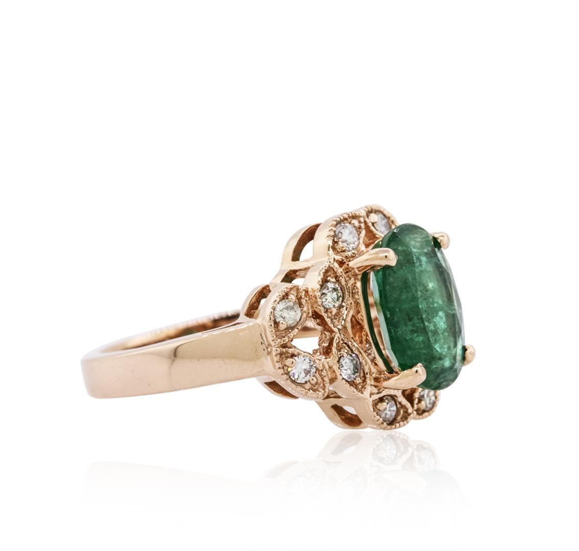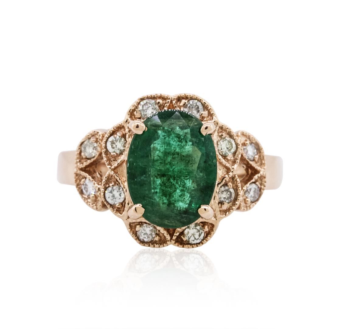 One ring featuring: 14KT rose gold weighing 6.10 grams containing one prong set oval cut emerald with a total weight of 2.36ct and pave set round cut diamonds with a total weight of 0.28cts.