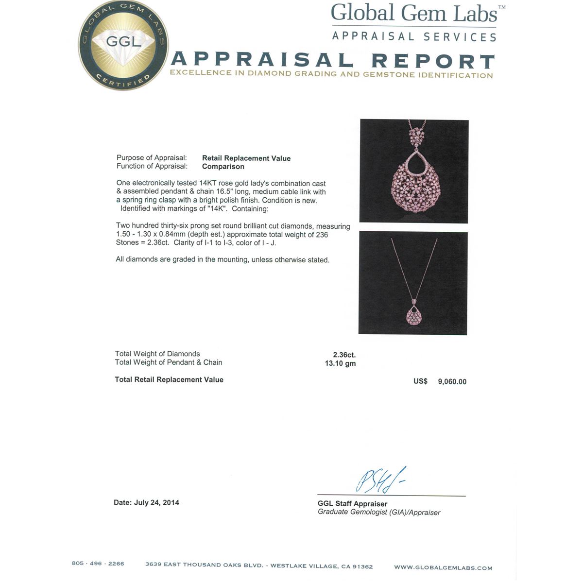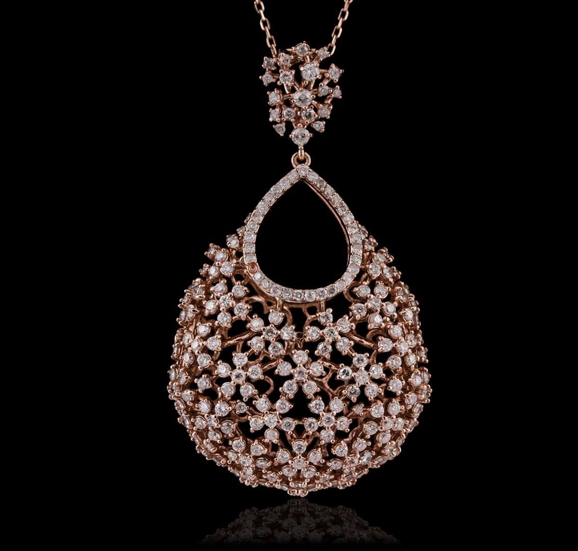 One electronically tested 14KT rose gold ladies combination cast & assembled pendant & chain 16.5" long, medium cable link with a spring ring clasp with a bright polish finish. Condition is new. Identified with markings of "14K". Containing: Two Hundred Thirty-Six prong set round brilliant cut diamonds, measuring 1.50 - 1.30 x 0.84mm (depth est.) approximate total weight of 236 Stones = 2.36ct. Clarity: I-1 to I-3. Color: I - J. All diamonds are graded in the mounting, unless otherwise stated. Total Weight of Diamonds 2.36ct. Total Weight of Pendant & Chain 13.10 grams. GGL Appraised at $9,060.00.