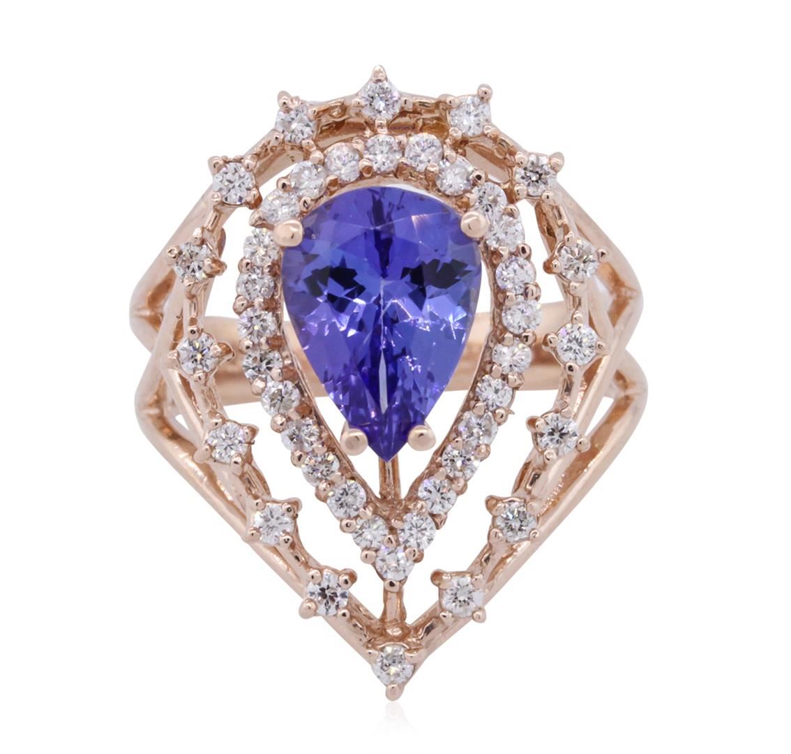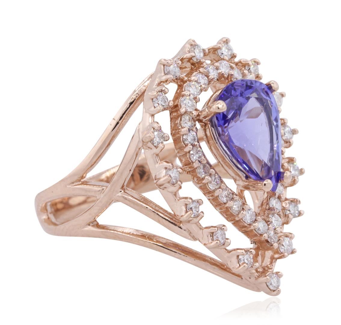 One electronically tested 14KT rose gold ladies combination cast & assembled tanzanite and diamond ring with a bright polish finish. Identified with markings of "K14". Condition is new. Containing: One prong set pear modified brilliant cut natural tanzanite, measuring 10.00 x 7.40 x 4.82mm, approximate weight of 2.39ct., clarity is eye clean, type I, medium, moderately strong, violet color, (GIA V 5/4), cut is good. Forty-Two prong set round brilliant cut diamonds, measuring 1.50 - 1.40 x 0.87mm (depth est.) approximate total weight of 42 Stones = 0.47ct. Clarity: SI-1 to SI-2. Color: J - K, Cut is Good. Colored gemstones are presumed to have been subjected to commonly used enhancement processes. All diamonds and colored gemstones are graded in the mounting, unless otherwise stated. Total Weight of Colored Stones 2.39ct. Total Weight of Diamonds 0.47ct. Total Weight of Ring 6.80 grams. GGL Appraised at $5,280.00.