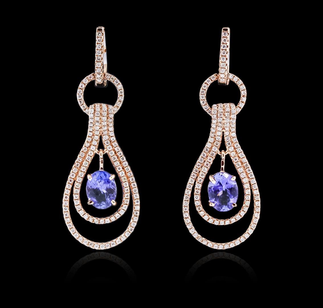 One pair electronically tested 14KT rose gold ladies cast tanzanite and diamond earrings with friction posts with a bright polish finish. Identified with markings of "14K". Condition is new. Containing: Two prong set oval modified brilliant cut natural tanzanites, measuring 8.00 x 6.00 x 3.90mm, approximate total weight of 2.50ct., clarity is eye clean, type I, medium light, moderately strong, violet color, (GIA V 4/4), cut is good. Two Hundred Eighty-Two prong set round brilliant cut diamonds, measuring 1.10 - 1.10 x 0.66mm (depth est.) approximate total weight of 282 Stones = 1.35ct. Clarity: I-1 to I-2. Color: I - J. Colored gemstones are presumed to have been subjected to commonly used enhancement processes. All diamonds and colored gemstones are graded in the mounting, unless otherwise stated. Total Weight of Colored Stones 2.50ct. Total Weight of Diamonds 1.35ct. Total Weight of Earrings 7.10 grams. GGL Appraised at $5,560.00.