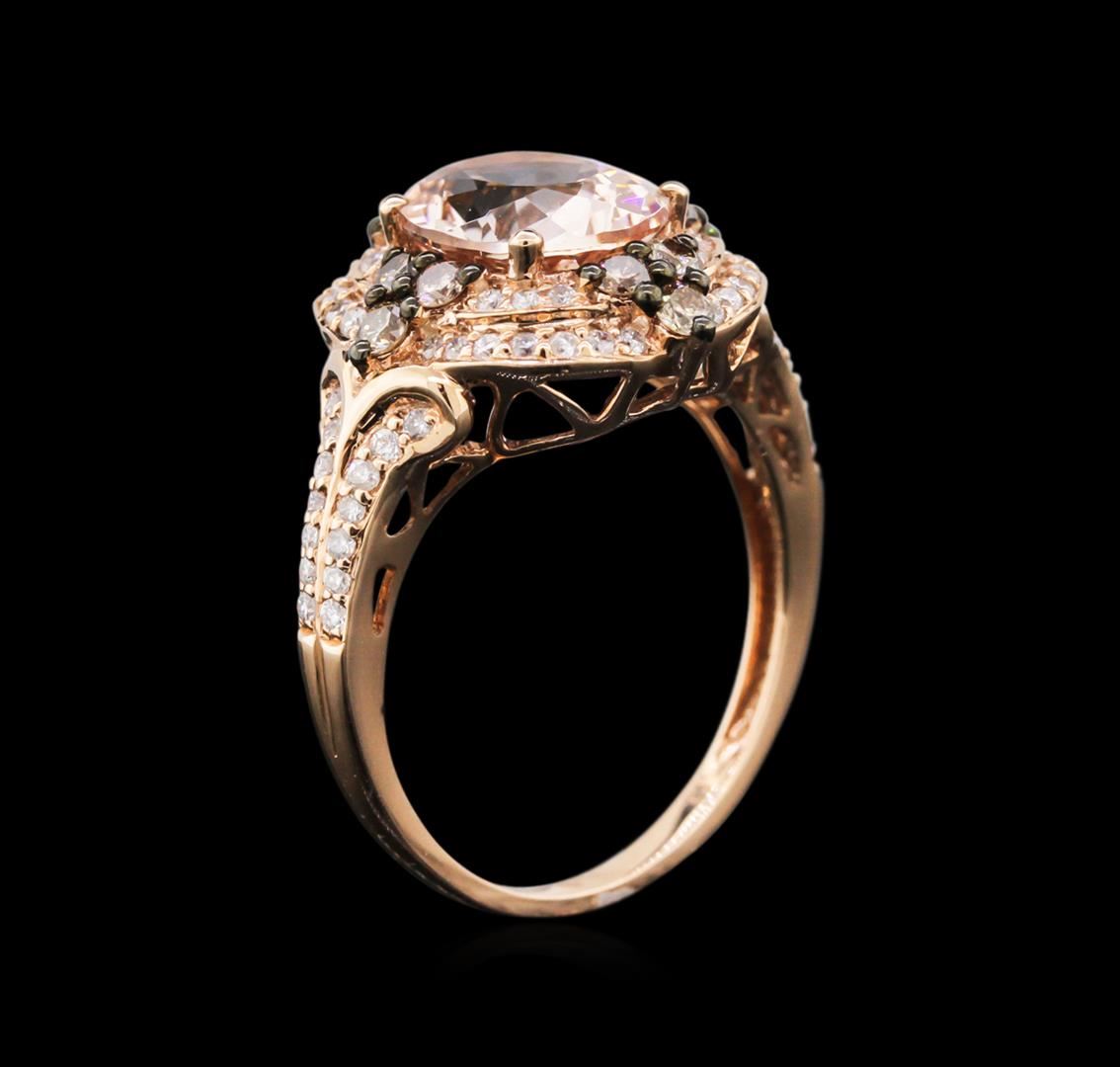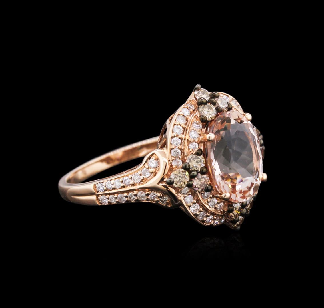 One ring featuring: 14KT rose gold weighing 3.44 grams containing one morganite center stone with a total weight of 2.52ct, 12 brown diamonds with a total weight of 0.44ct, and 68 round white diamonds with a total weight of 0.39ct.