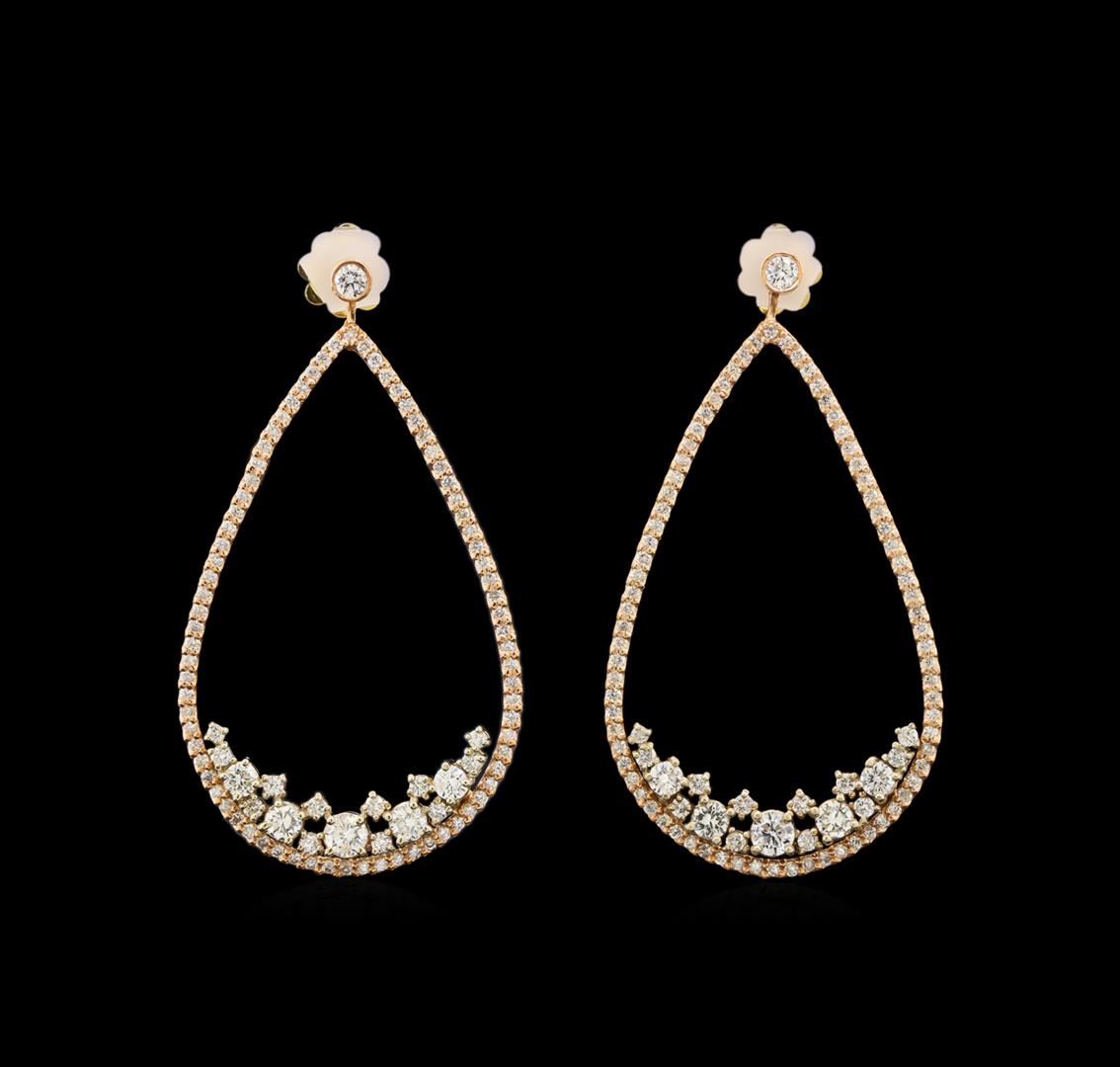One pair electronically tested 14KT rose gold ladies cast diamond earrings with friction posts with a bright polish finish. Identified with markings of "585". Condition is new. Containing: Twelve prong set round brilliant cut diamonds, measuring 3.30 x 1.98mm (depth est.) approximate total weight of 12 Stones = 1.58ct. Clarity: SI-1 to SI-2. Color: I - J, Cut is Good. One Hundred Seventy-Six prong set round brilliant cut diamonds, measuring 1.30 - 1.00 x 0.69mm (depth est.) approximate total weight of 176 Stones = 0.97ct. Clarity: SI-2 to I-2. Color: I - J, Cut is Good. All diamonds are graded in the mounting, unless otherwise stated. Total Weight of Diamonds 2.55ct. Total Weight of Earrings 6.70 grams. GGL Appraised at $4,280.00.