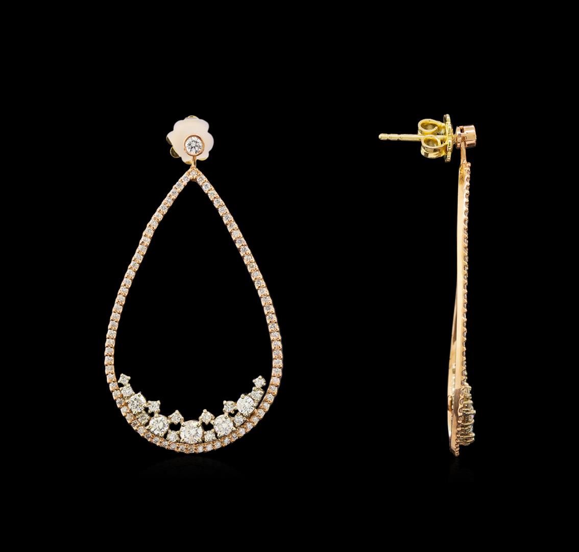 One pair electronically tested 14KT rose gold ladies cast diamond earrings with friction posts with a bright polish finish. Identified with markings of "585". Condition is new. Containing: Twelve prong set round brilliant cut diamonds, measuring 3.30 x 1.98mm (depth est.) approximate total weight of 12 Stones = 1.58ct. Clarity: SI-1 to SI-2. Color: I - J, Cut is Good. One Hundred Seventy-Six prong set round brilliant cut diamonds, measuring 1.30 - 1.00 x 0.69mm (depth est.) approximate total weight of 176 Stones = 0.97ct. Clarity: SI-2 to I-2. Color: I - J, Cut is Good. All diamonds are graded in the mounting, unless otherwise stated. Total Weight of Diamonds 2.55ct. Total Weight of Earrings 6.70 grams. GGL Appraised at $4,280.00.