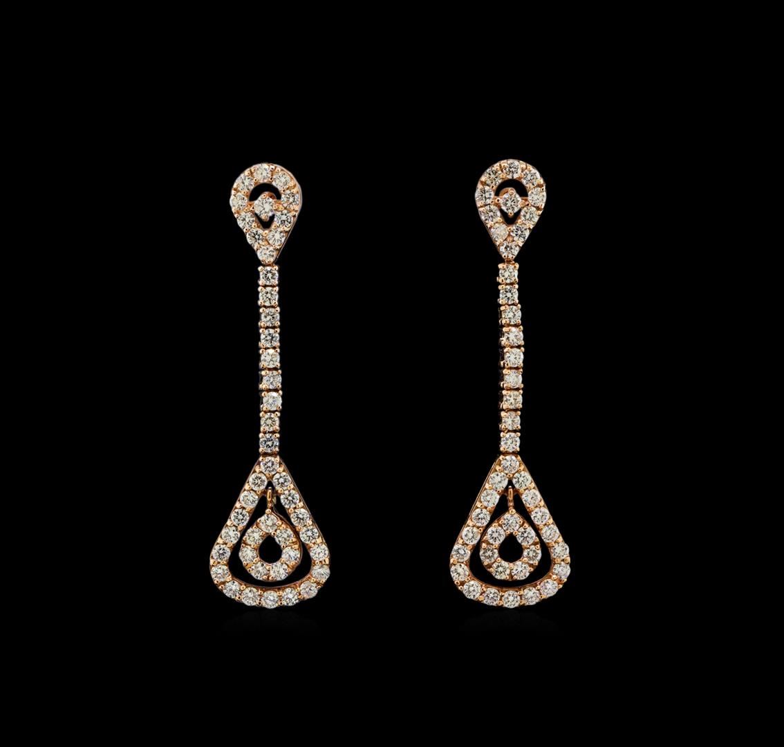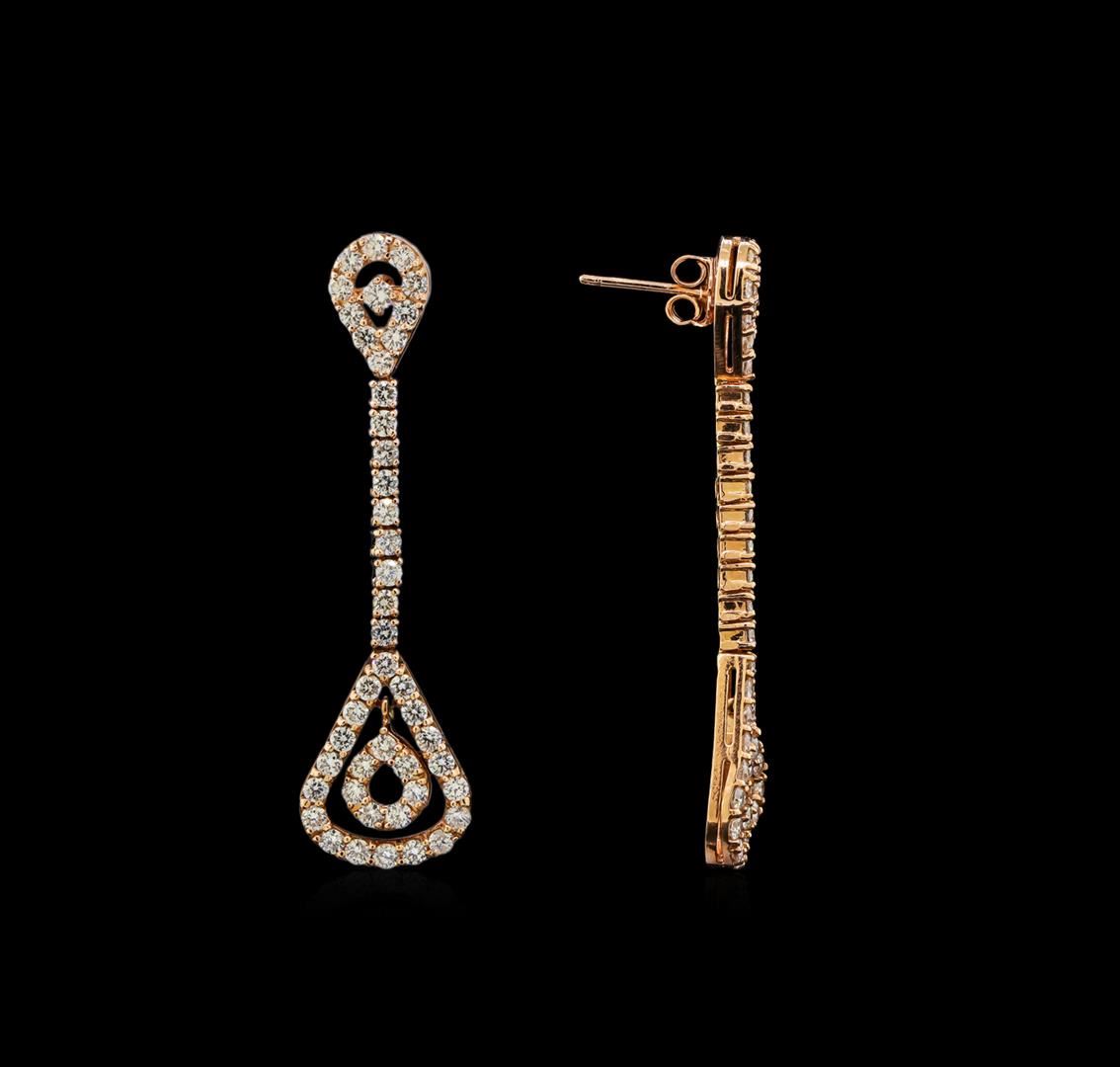 One pair electronically tested 14KT rose gold ladies cast diamond earrings with friction posts with a bright polish finish. Identified with markings of "14K". Condition is new. Containing: Ninety prong set round brilliant cut diamonds, measuring 1.90 - 1.50 x 1.02mm (depth est.) approximate total weight of 90 Stones = 2.57ct. Clarity: SI-1 to I-1. Color: H - I, Cut is Good. All diamonds are graded in the mounting, unless otherwise stated. Total Weight of Diamonds 2.57ct. Total Weight of Earrings 6.70 grams. GGL Appraised at $5,015.00.