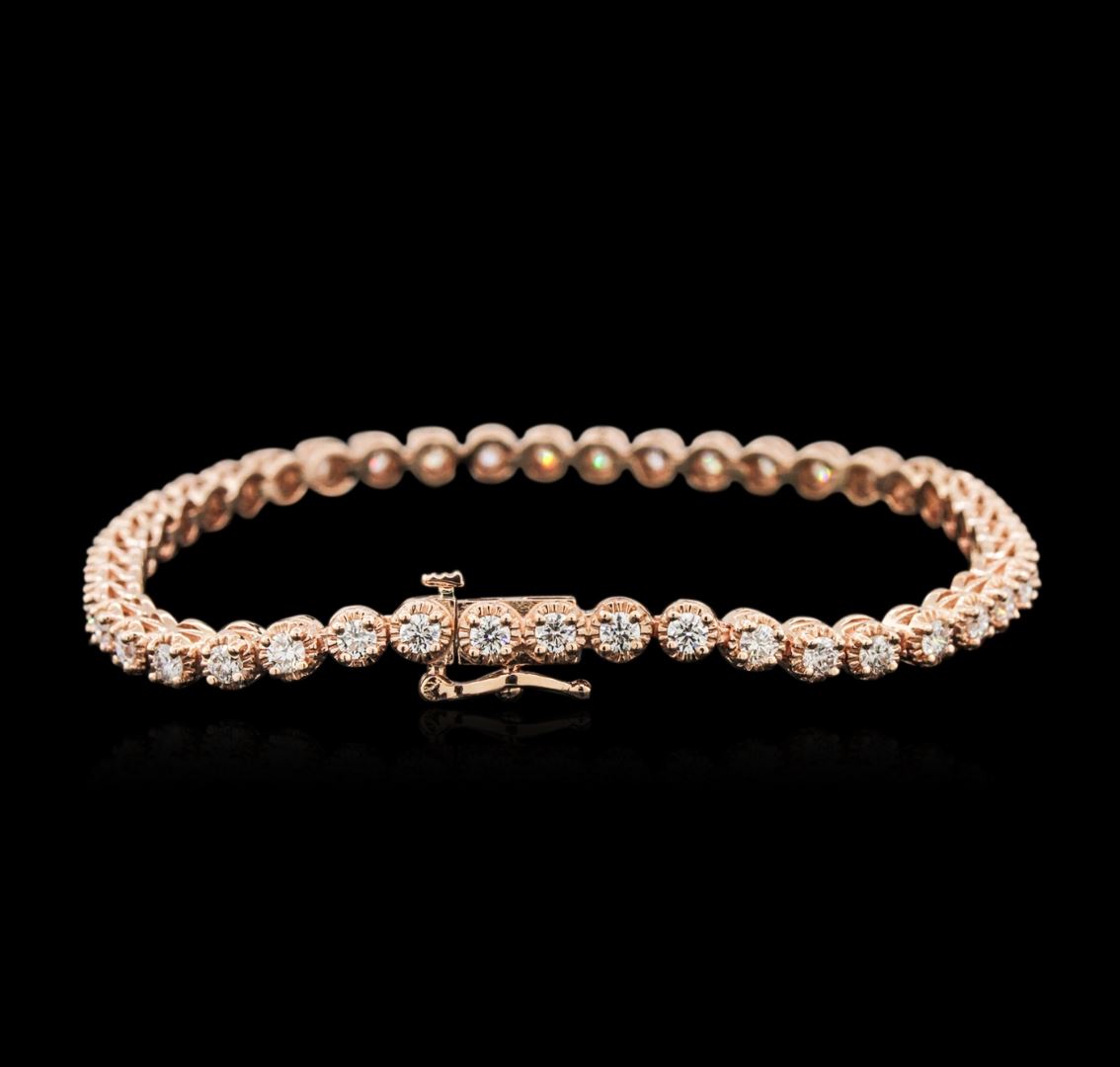 One electronically tested 14KT rose gold ladies cast diamond tennis bracelet with a hidden box clasp with safety closer with a bright polish finish. Measurements: 7 " in length Identified with markings of "14K". Condition is new. Containing: Forty-Five prong set round brilliant cut diamonds, measuring 2.50 - 2.50 x 1.50mm (depth est.) approximate total weight of 45 Stones = 2.57ct. Clarity: VS-2 to SI-1. Color: G - H, Cut is Good. All diamonds are graded in the mounting, unless otherwise stated. Total Weight of Diamonds 2.57ct. Total Weight of Tennis Bracelet 11.80 grams. GGL Appraised at $8,660.00.