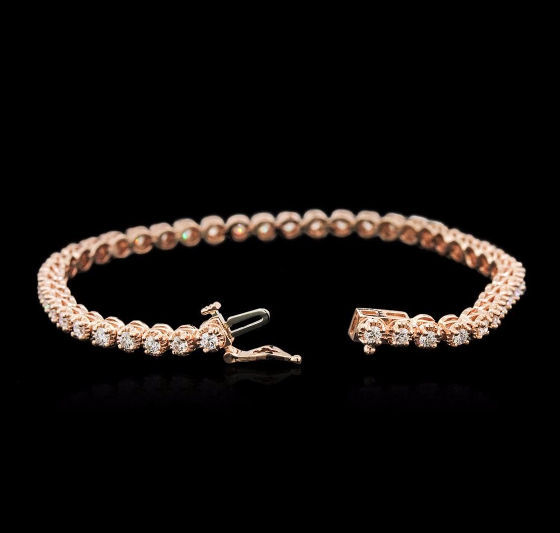 One electronically tested 14KT rose gold ladies cast diamond tennis bracelet with a hidden box clasp with safety closer with a bright polish finish. Measurements: 7 " in length Identified with markings of "14K". Condition is new. Containing: Forty-Five prong set round brilliant cut diamonds, measuring 2.50 - 2.50 x 1.50mm (depth est.) approximate total weight of 45 Stones = 2.57ct. Clarity: VS-2 to SI-1. Color: G - H, Cut is Good. All diamonds are graded in the mounting, unless otherwise stated. Total Weight of Diamonds 2.57ct. Total Weight of Tennis Bracelet 11.80 grams. GGL Appraised at $8,660.00.