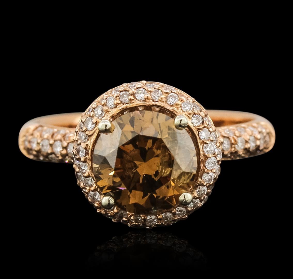 One electronically tested 14KT rose gold ladies cast diamond ring with a bright polish finish. The featured diamond is set within a diamond bezel supported by a diamond set under gallery and diamond set shoulders, completed by a two and one-half millimeter wide band. Identified with markings of "K14". Condition is new, good workmanship. Containing: One prong set round brilliant cut diamond, measuring 7.87 - 7.85 x 5.10mm (depth est.), 5.00.%. GTCF approximate weight of 2.10ct. Graded in the setting. Clarity: I-1. Depth: 64.9%. Table 59.8%. Ninety-Eight prong set round brilliant cut diamonds, measuring 1.10 - 1.00 x 0.63mm (depth est.) approximate. Total Weight of 98 Stones = 0.51ct. Graded in the setting. Clarity: I-1 to I-2. Color: G - I. Total Weight of Diamonds 2.61ct. Total Weight of Ring 4.90gm. AIG Appraised at $21,195.00.