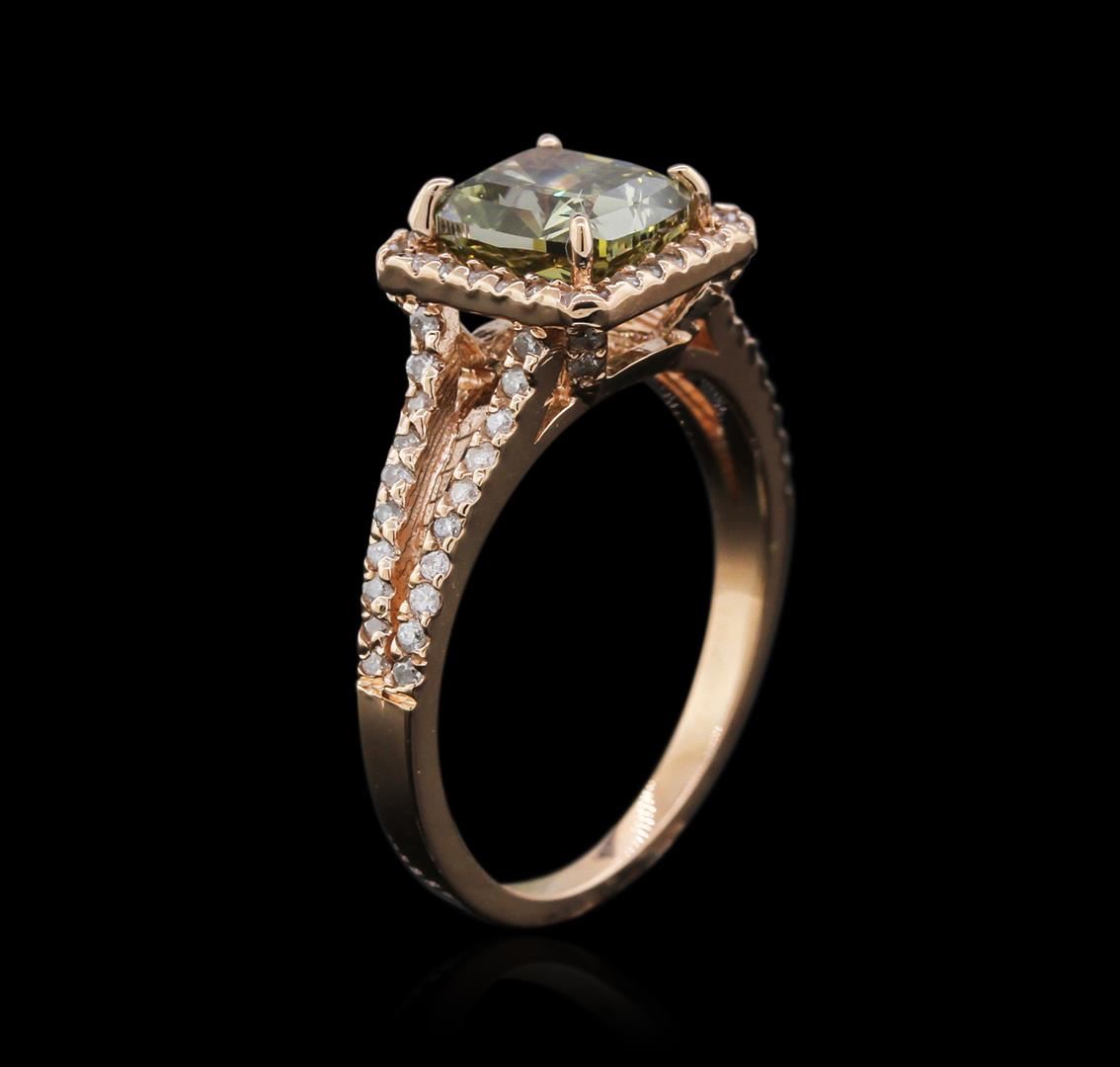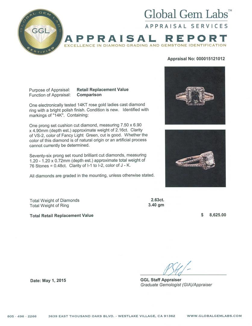 One electronically tested 14KT rose gold ladies cast diamond ring with a bright polish finish. Identified with markings of "14K". Condition is new. Containing: One prong set cushion cut diamond, measuring 7.50 x 6.90 x 4.90mm (depth est.) approximate weight of 2.16ct. Clarity: VS-2, color of Fancy Light Green, Cut is Good. Whether the color of this diamond is of natural origin or an artificial process cannot currently be determined. Seventy-Six prong set round brilliant cut diamonds, measuring 1.20 - 1.20 x 0.72mm (depth est.) approximate total weight of 76 Stones = 0.48ct. Clarity: I-1 to I-2. Color: J - K. All diamonds are graded in the mounting, unless otherwise stated. Total Weight of Diamonds 2.63ct. Total Weight of Ring 3.40 grams. GGL Appraised at $8,625.00.