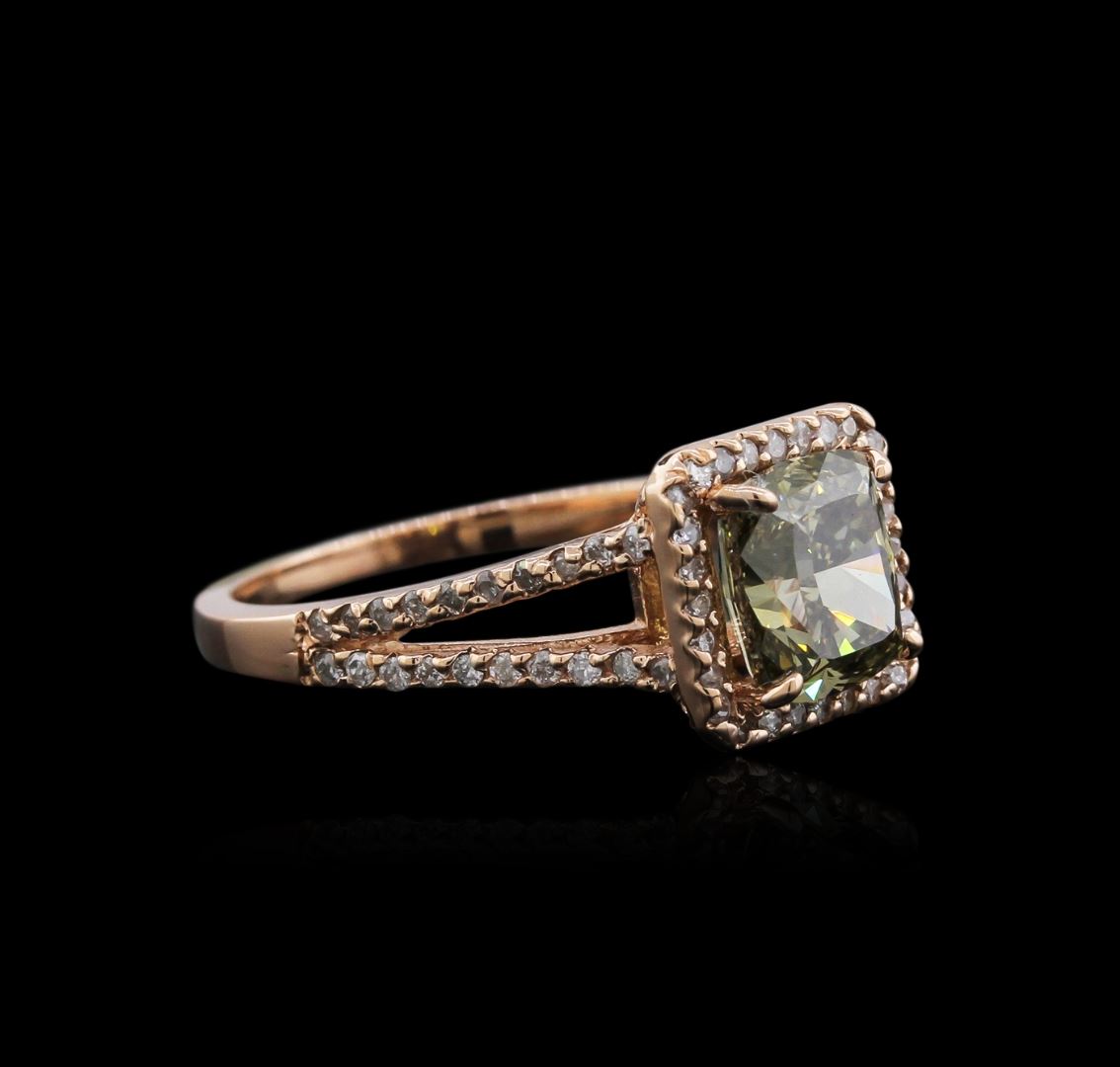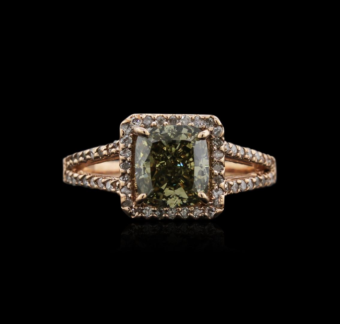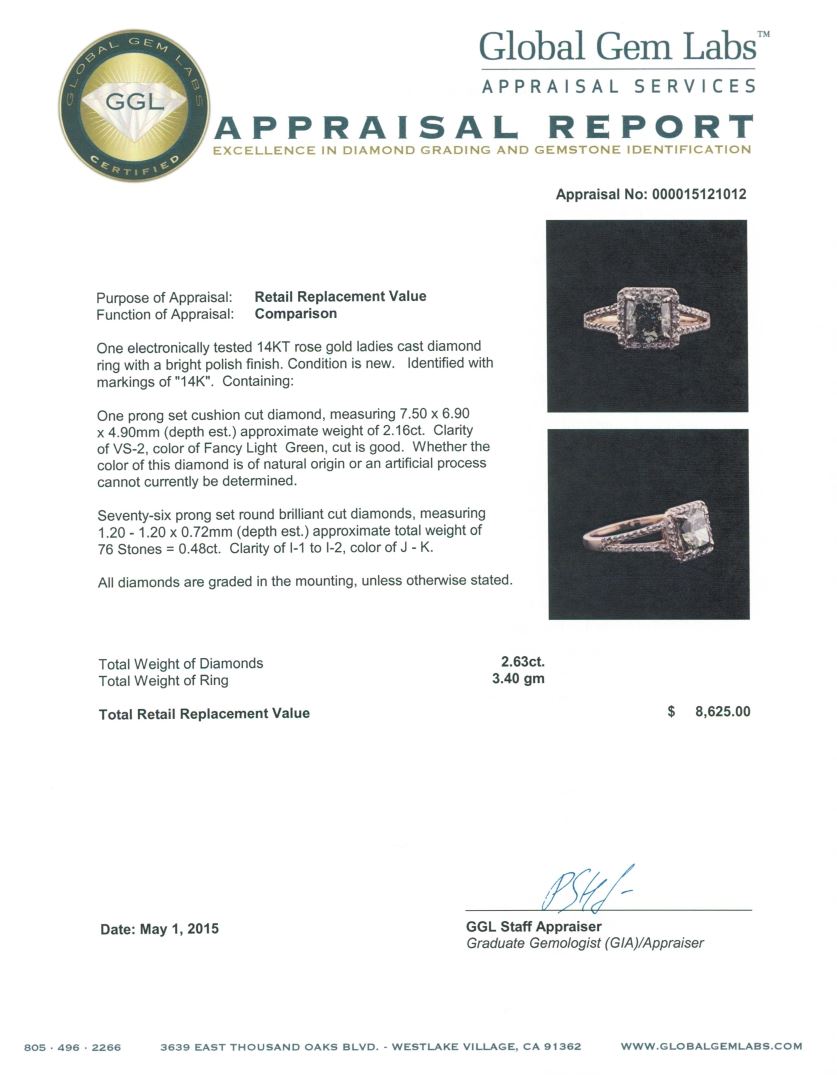 One electronically tested 14KT rose gold ladies cast diamond ring with a bright polish finish. Identified with markings of "14K". Condition is new. Containing: One prong set cushion cut diamond, measuring 7.50 x 6.90 x 4.90mm (depth est.) approximate weight of 2.16ct. Clarity: VS-2, color of Fancy Light Green, Cut is Good. Whether the color of this diamond is of natural origin or an artificial process cannot currently be determined. Seventy-Six prong set round brilliant cut diamonds, measuring 1.20 - 1.20 x 0.72mm (depth est.) approximate total weight of 76 Stones = 0.48ct. Clarity: I-1 to I-2. Color: J - K. All diamonds are graded in the mounting, unless otherwise stated. Total Weight of Diamonds 2.63ct. Total Weight of Ring 3.40 grams. GGL Appraised at $8,625.00.