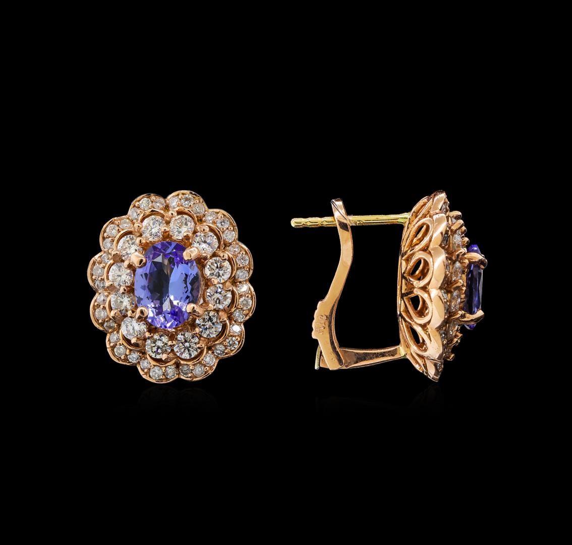 One pair electronically tested 14KT rose gold ladies combination cast & assembled tanzanite and diamond earrings with lever backs with a bright polish finish. Identified with markings of "K14". Condition is new. Containing: Two prong set oval modified brilliant cut natural tanzanites, measuring 8.00 x 6.00 x 3.90mm, approximate total weight of 2.64ct., clarity is eye clean, type I, medium, moderately strong, violet color, (GIA V 5/4), cut is good. Twenty-Four prong set round brilliant cut diamonds, measuring 2.10 - 2.10 x 1.26mm (depth est.) approximate total weight of 24 Stones = 0.81ct. Clarity of SI-1, Color of H - I, Cut is Good. Seventy-Two prong set round brilliant cut diamonds, measuring 1.30 - 1.30 x 0.78mm (depth est.) approximate total weight of 72 Stones = 0.58ct. Clarity of SI-2 to I-2, Color of I - J, Cut is Good. All diamonds and colored gemstones are graded in the mounting, unless otherwise stated. Colored gemstones are presumed to have been subjected to commonly used enhancement processes. Total Weight of Colored Stones 2.64ct. Total Weight of Diamonds 1.39ct. Total Weight of Earrings 9.20 grams. GGL Appraised at $5,795.00.