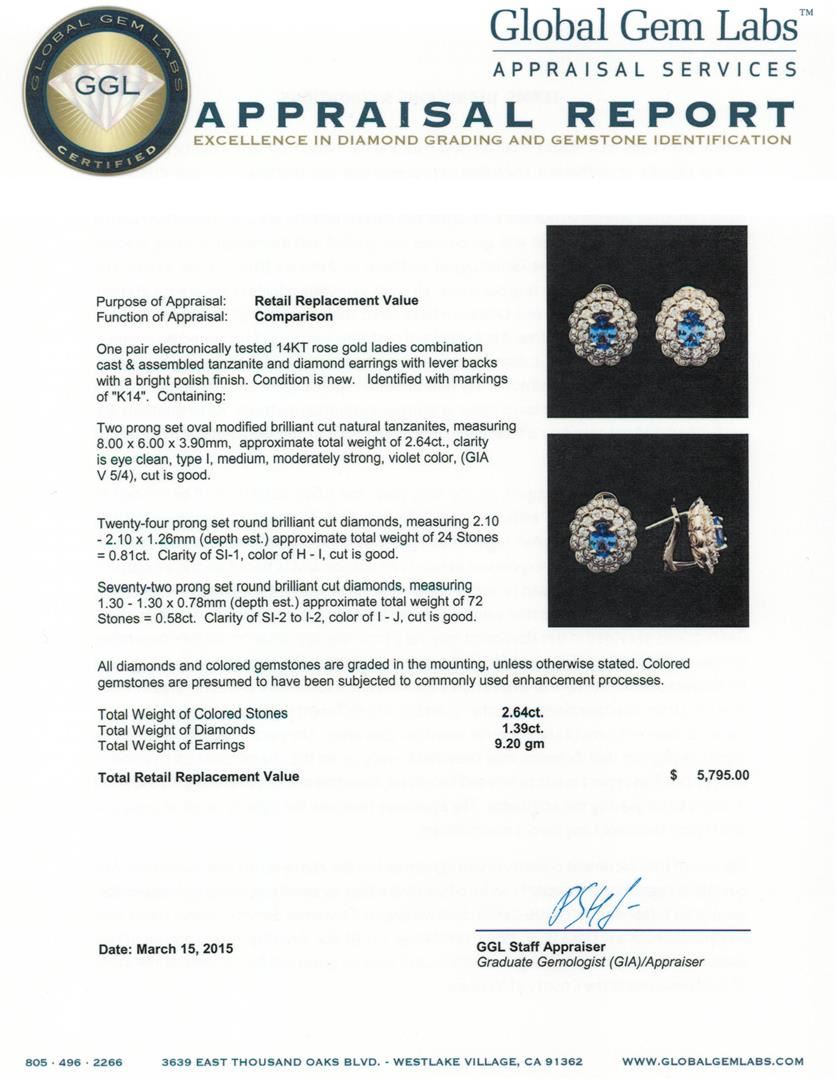 One pair electronically tested 14KT rose gold ladies combination cast & assembled tanzanite and diamond earrings with lever backs with a bright polish finish. Identified with markings of "K14". Condition is new. Containing: Two prong set oval modified brilliant cut natural tanzanites, measuring 8.00 x 6.00 x 3.90mm, approximate total weight of 2.64ct., clarity is eye clean, type I, medium, moderately strong, violet color, (GIA V 5/4), cut is good. Twenty-Four prong set round brilliant cut diamonds, measuring 2.10 - 2.10 x 1.26mm (depth est.) approximate total weight of 24 Stones = 0.81ct. Clarity of SI-1, Color of H - I, Cut is Good. Seventy-Two prong set round brilliant cut diamonds, measuring 1.30 - 1.30 x 0.78mm (depth est.) approximate total weight of 72 Stones = 0.58ct. Clarity of SI-2 to I-2, Color of I - J, Cut is Good. All diamonds and colored gemstones are graded in the mounting, unless otherwise stated. Colored gemstones are presumed to have been subjected to commonly used enhancement processes. Total Weight of Colored Stones 2.64ct. Total Weight of Diamonds 1.39ct. Total Weight of Earrings 9.20 grams. GGL Appraised at $5,795.00.