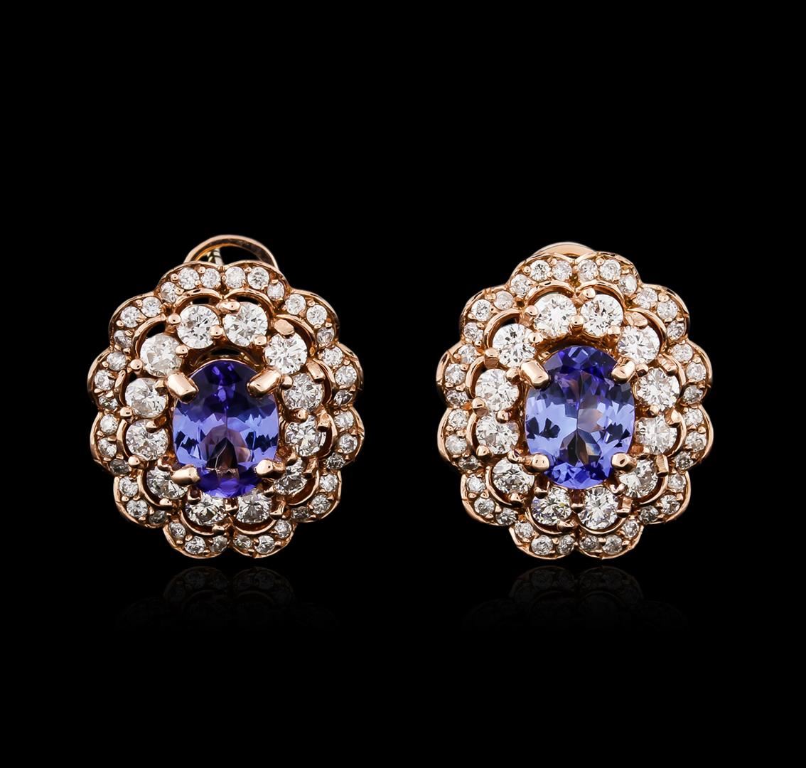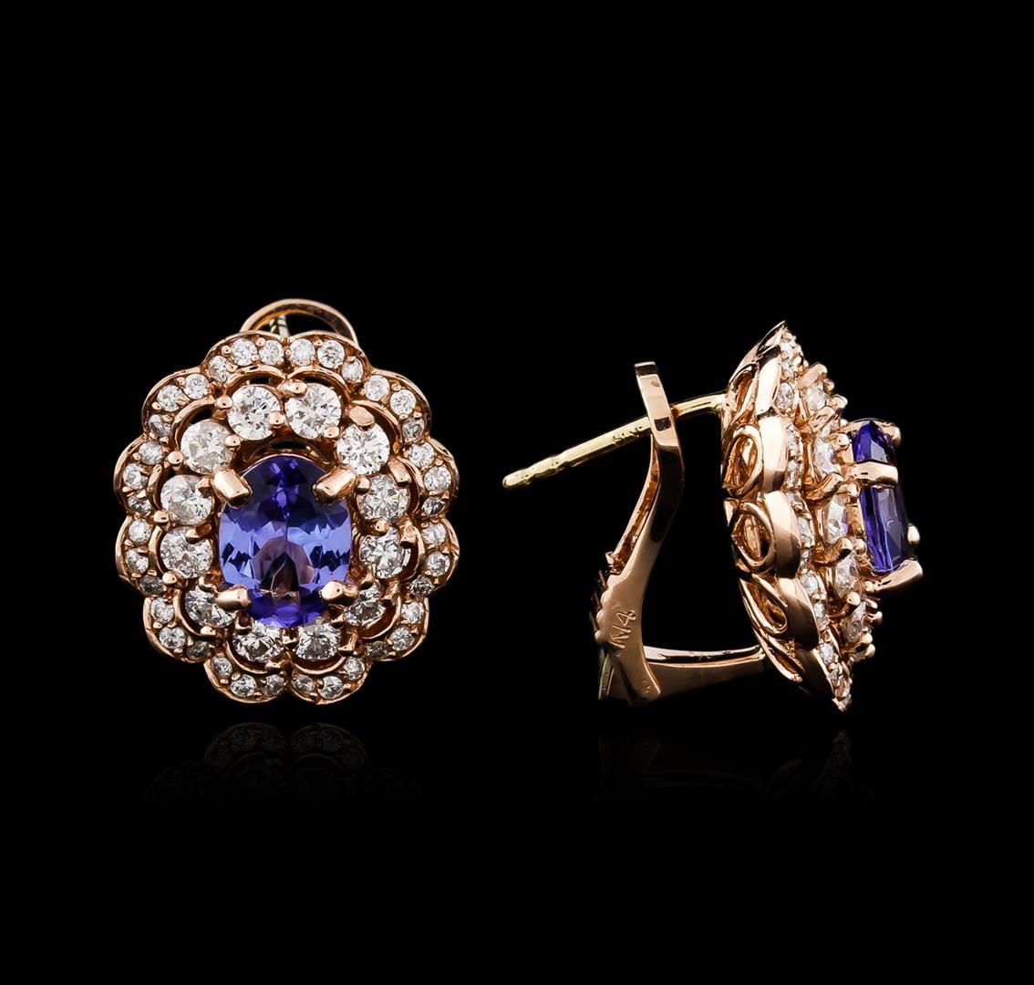 One pair electronically tested 14KT rose gold ladies combination cast & assembled tanzanite and diamond earrings with lever backs with a bright polish finish. Identified with markings of "K14". Condition is new. Containing: Two prong set oval modified brilliant cut natural tanzanites, measuring 8.00 x 6.00 x 3.90mm, approximate total weight of 2.64ct., clarity is eye clean, type I, medium, moderately strong, violet color, (GIA V 5/4), cut is good. Twenty-Four prong set round brilliant cut diamonds, measuring 2.10 - 2.10 x 1.26mm (depth est.) approximate total weight of 24 Stones = 0.81ct. Clarity of SI-1, Color of H - I, Cut is Good. Seventy-Two prong set round brilliant cut diamonds, measuring 1.30 - 1.30 x 0.78mm (depth est.) approximate total weight of 72 Stones = 0.58ct. Clarity of SI-2 to I-2, Color of I - J, Cut is Good. All diamonds and colored gemstones are graded in the mounting, unless otherwise stated. Colored gemstones are presumed to have been subjected to commonly used enhancement processes. Total Weight of Colored Stones 2.64ct. Total Weight of Diamonds 1.39ct. Total Weight of Earrings 9.20 grams. GGL Appraised at $5,795.00.