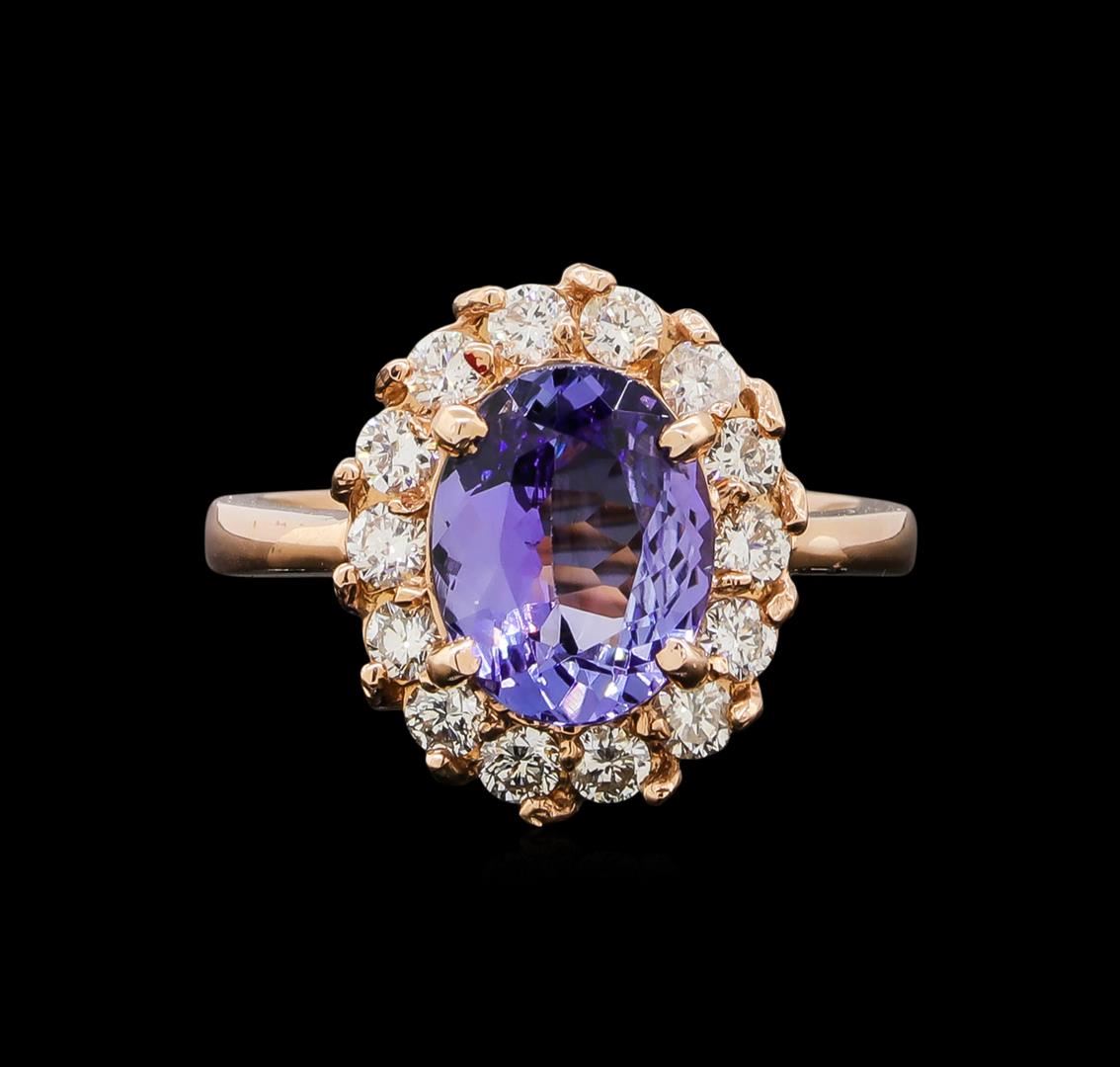 One electronically tested 14KT rose gold ladies cast tanzanite and diamond ring with a bright polish finish. Identified with markings of "K14". Condition is new. Containing: One prong set oval modified brilliant cut natural tanzanite, measuring 10.10 x 8.00 x 4.72mm, approximate weight of 2.68ct., clarity is eye clean, type I, medium light, very slightly grayish, violet color, (GIA V 4/3), cut is good. Thirteen prong set round brilliant cut diamonds, measuring 2.30 - 2.30 x 1.38mm (depth est.) approximate total weight of 13 Stones = 0.58ct. Clarity: SI-1 to SI-2. Color: K - L, Cut is Good. Colored gemstones are presumed to have been subjected to commonly used enhancement processes. All diamonds and colored gemstones are graded in the mounting, unless otherwise stated. Total Weight of Colored Stones 2.68ct. Total Weight of Diamonds 0.58ct. Total Weight of Ring 5.40 grams. GGL Appraised at $3,920.00.