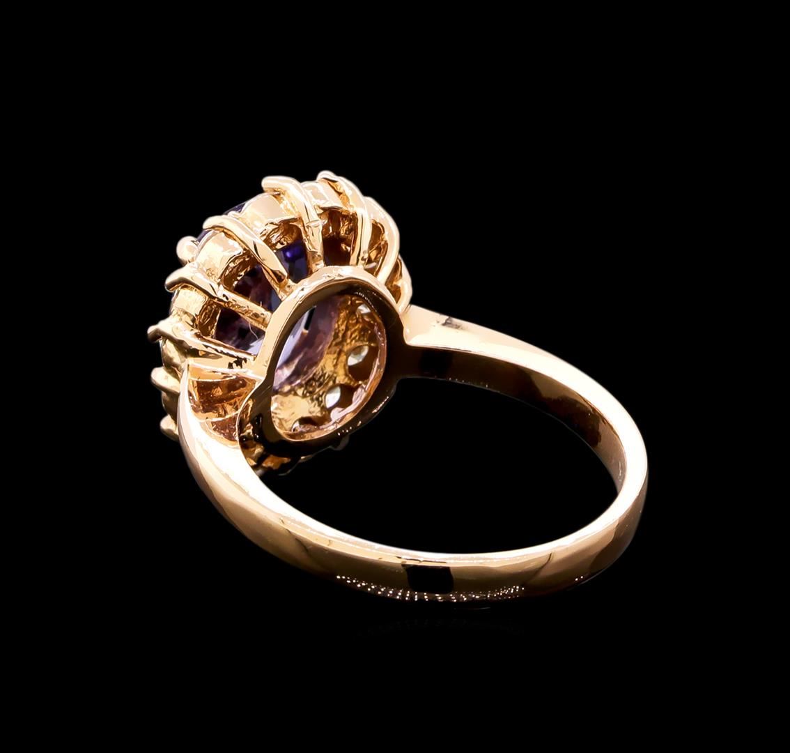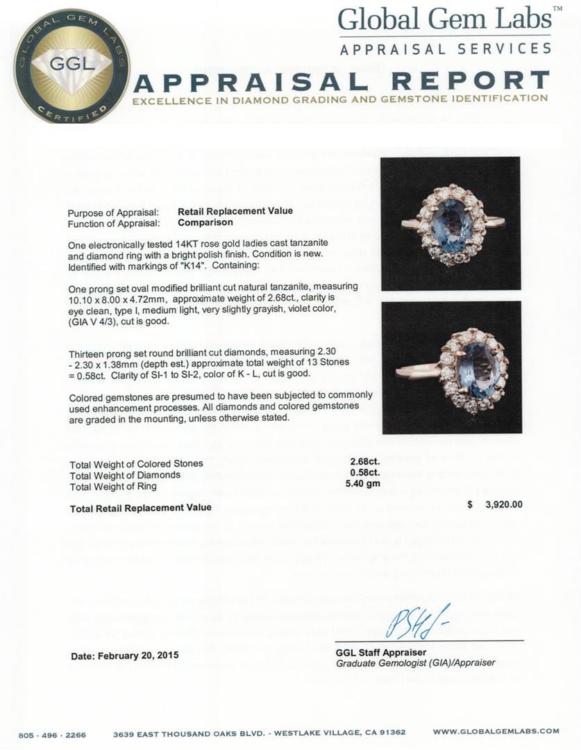 One electronically tested 14KT rose gold ladies cast tanzanite and diamond ring with a bright polish finish. Identified with markings of "K14". Condition is new. Containing: One prong set oval modified brilliant cut natural tanzanite, measuring 10.10 x 8.00 x 4.72mm, approximate weight of 2.68ct., clarity is eye clean, type I, medium light, very slightly grayish, violet color, (GIA V 4/3), cut is good. Thirteen prong set round brilliant cut diamonds, measuring 2.30 - 2.30 x 1.38mm (depth est.) approximate total weight of 13 Stones = 0.58ct. Clarity: SI-1 to SI-2. Color: K - L, Cut is Good. Colored gemstones are presumed to have been subjected to commonly used enhancement processes. All diamonds and colored gemstones are graded in the mounting, unless otherwise stated. Total Weight of Colored Stones 2.68ct. Total Weight of Diamonds 0.58ct. Total Weight of Ring 5.40 grams. GGL Appraised at $3,920.00.