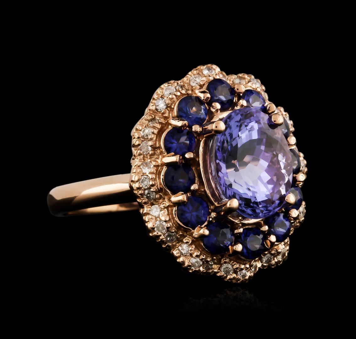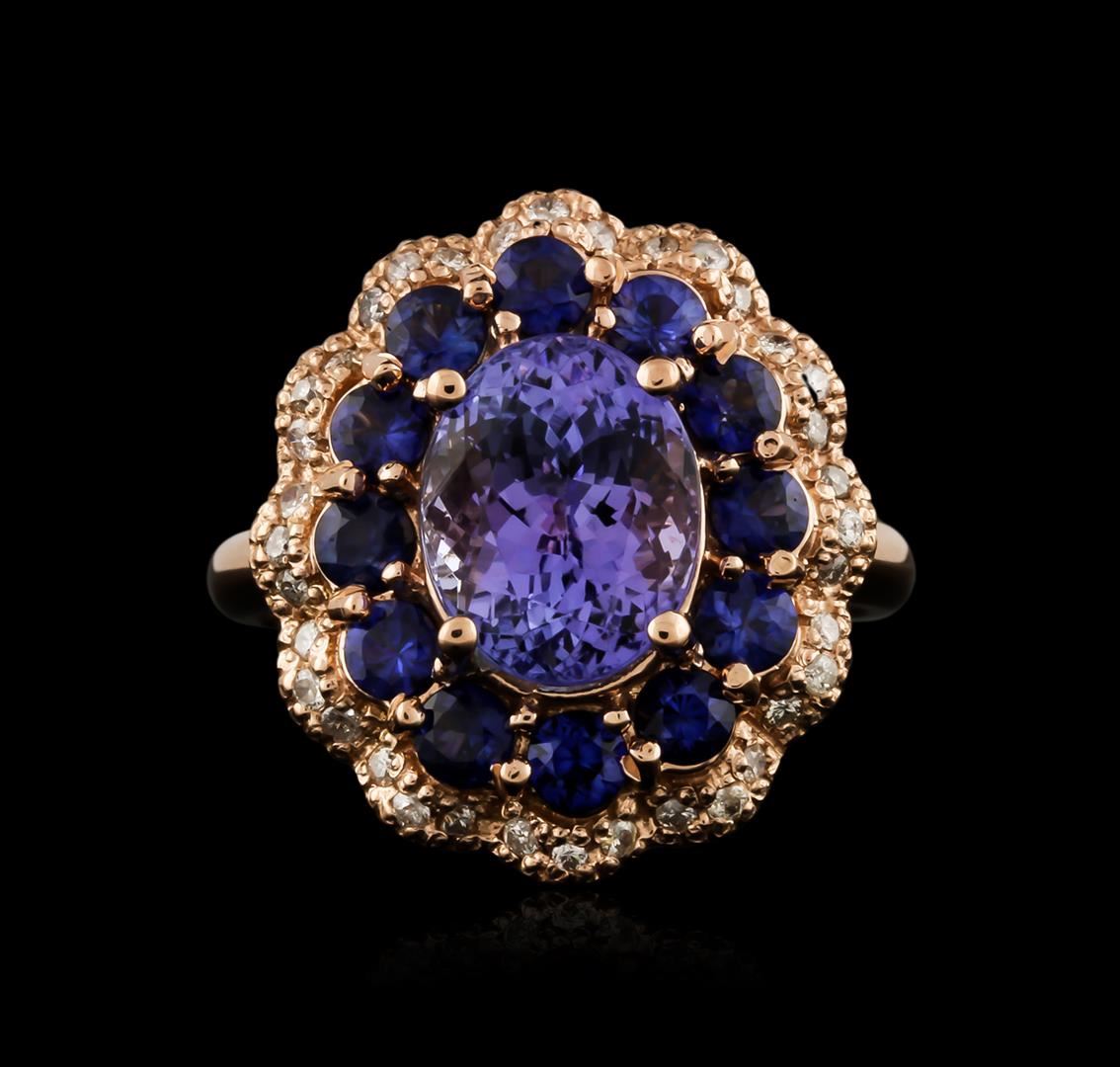 One electronically tested 14KT rose gold ladies cast tanzanite, sapphire and diamond ring with a bright polish finish. Identified with markings of "K14". Condition is new. Containing: One prong set oval modified brilliant cut natural tanzanite, measuring 9.90 x 7.80 x 5.07mm, approximate weight of 2.75ct., clarity is eye clean, type I, medium light, very slightly grayish, violet color, (GIA V 4/3), cut is good. Twelve prong set round modified brilliant cut natural blue sapphires, measuring 3.00 - 3.00 x 1.97 mm, approximate total weight of 1.68ct., clarity is slightly included, type II, medium, moderately strong, blue color, (GIA B 5/4), cut is good. Thirty-Six prong set round brilliant cut diamonds, measuring 1.00 - 1.00 x 0.60mm (depth est.) approximate total weight of 36 Stones = 0.13ct. Clarity: I-2. Color: J - K, Cut is Good. Colored gemstones are presumed to have been subjected to commonly used enhancement processes. All diamonds and colored gemstones are graded in the mounting, unless otherwise stated. Total Weight of Colored Stones 4.43ct. Total Weight of Diamonds 0.13ct. Total Weight of Ring 8.00 grams. GGL Appraised at $4,190.00.