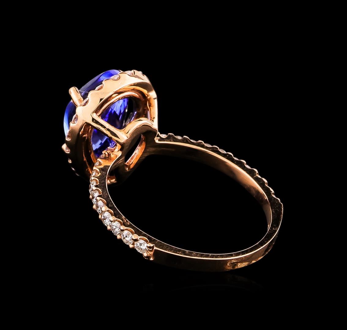 One electronically tested 14KT rose gold Ladies combination cast & assembled ring with a bright polish finish. Condition is new. Identified with markings of "14K". Containing: One prong set pear modified brilliant cut natural tanzanite, measuring 10.09 x 7.95 x 5.16mm, approximate. Total Weight of 2.77ct., clarity is eye clean, type I, medium, moderately strong, bluish violet color, (GIA bV 5/4), cut is good. Forty prong set round brilliant cut diamonds, measuring 1.50 - 1.50 x 0.90mm (depth est.) approximate. Total Weight of 40 Stones = 0.49ct. Clarity: I-1 to I-2. Color: I - J, Cut is Good. Colored gemstones are presumed to have been subjected to commonly used enhancement processes. All diamonds and colored gemstones are graded in the mounting, unless otherwise stated. Total Weight of Colored Stones 2.77ct. Total Weight of Diamonds 0.49ct. Total Weight of Ring 3.70 grams. GGL Appraised.