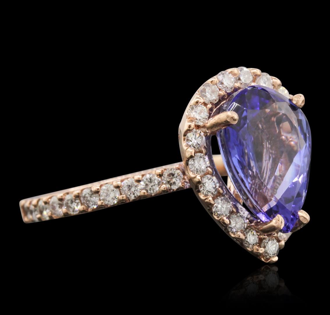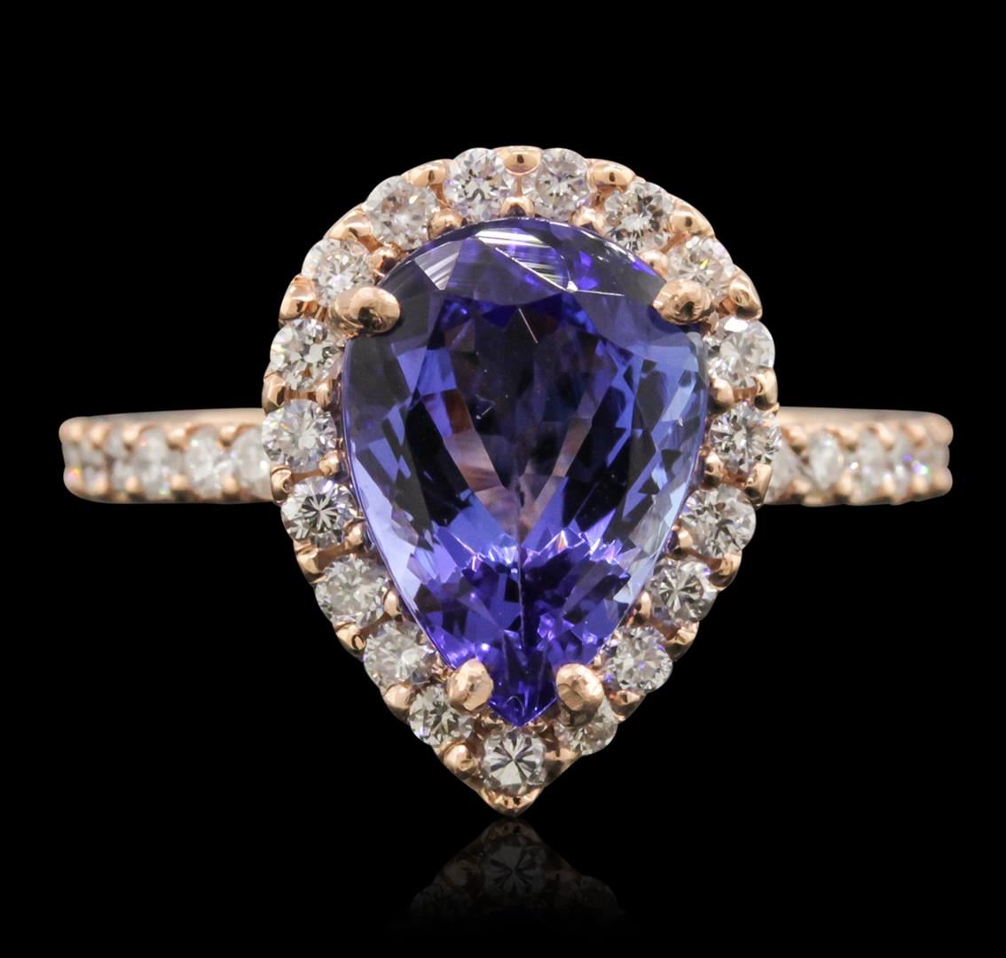One electronically tested 14KT rose gold Ladies combination cast & assembled ring with a bright polish finish. Condition is new. Identified with markings of "14K". Containing: One prong set pear modified brilliant cut natural tanzanite, measuring 10.09 x 7.95 x 5.16mm, approximate. Total Weight of 2.77ct., clarity is eye clean, type I, medium, moderately strong, bluish violet color, (GIA bV 5/4), cut is good. Forty prong set round brilliant cut diamonds, measuring 1.50 - 1.50 x 0.90mm (depth est.) approximate. Total Weight of 40 Stones = 0.49ct. Clarity: I-1 to I-2. Color: I - J, Cut is Good. Colored gemstones are presumed to have been subjected to commonly used enhancement processes. All diamonds and colored gemstones are graded in the mounting, unless otherwise stated. Total Weight of Colored Stones 2.77ct. Total Weight of Diamonds 0.49ct. Total Weight of Ring 3.70 grams. GGL Appraised at $5,910.00.