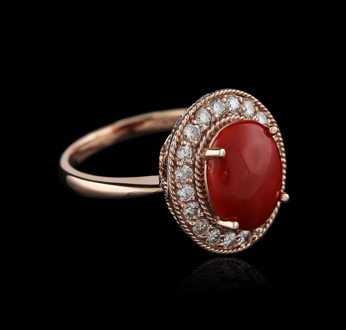One electronically tested 14KT rose gold ladies cast coral and diamond ring with a flat shank with a bright polish finish. Identified with markings of "K14". Condition is new. Containing: One prong set cabochon cabochon modified brilliant cut natural red coral, measuring 11.40 x 9.07 x 3.78mm, approximate weight of 2.80ct., clarity is heavily included, medium dark, brownish, red color, (GIA R 6/1), cut is good. Twenty prong set round brilliant cut diamonds, measuring 1.80 - 1.80 x 1.08mm (depth est.) approximate total weight of 20 Stones = 0.43ct. Clarity: SI-1 to I-1. Color: I - J, Cut is Good. All diamonds and colored gemstones are graded in the mounting, unless otherwise stated. Colored gemstones are presumed to have been subjected to commonly used enhancement processes.. Total Weight of Colored Stones 2.80ct. Total Weight of Diamonds 0.43ct. Total Weight of Ring 5.10 grams. GGL Appraised at $1,525.00.