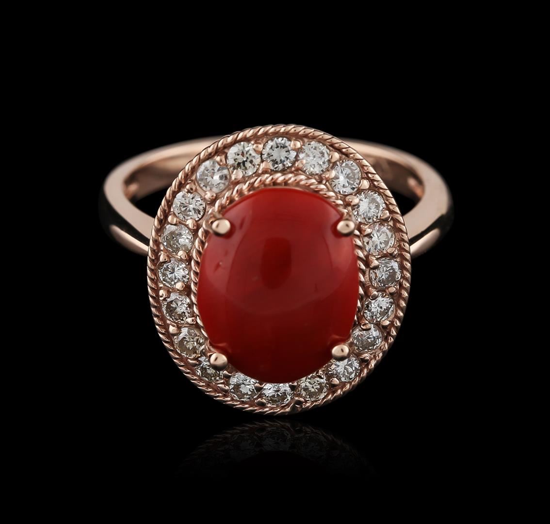 One electronically tested 14KT rose gold ladies cast coral and diamond ring with a flat shank with a bright polish finish. Identified with markings of "K14". Condition is new. Containing: One prong set cabochon cabochon modified brilliant cut natural red coral, measuring 11.40 x 9.07 x 3.78mm, approximate weight of 2.80ct., clarity is heavily included, medium dark, brownish, red color, (GIA R 6/1), cut is good. Twenty prong set round brilliant cut diamonds, measuring 1.80 - 1.80 x 1.08mm (depth est.) approximate total weight of 20 Stones = 0.43ct. Clarity: SI-1 to I-1. Color: I - J, Cut is Good. All diamonds and colored gemstones are graded in the mounting, unless otherwise stated. Colored gemstones are presumed to have been subjected to commonly used enhancement processes.. Total Weight of Colored Stones 2.80ct. Total Weight of Diamonds 0.43ct. Total Weight of Ring 5.10 grams. GGL Appraised at $1,525.00.
