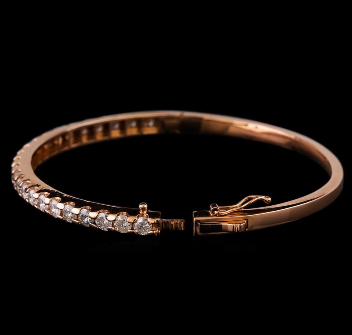 One electronically tested 14KT rose gold ladies combination cast & assembled bangle bracelet with a hidden box clasp with safety closer with a bright polish finish. Measurements: 2.50 x 2.00. Identified with markings of K14. Condition is new. Containing: Twenty-Four prong set round brilliant cut diamonds, measuring 3.20 - 3.20 x 1.92mm (depth est.) approximate total weight of 24 Stones = 2.88ct. Clarity: I-1 to I-2. Color: I - J, Cut is Good. All diamonds are graded in the mounting, unless otherwise stated. Total Weight of Diamonds 2.88ct. Total Weight of Bracelet 14.80 grams. GGL Appraised at $7,725.00.