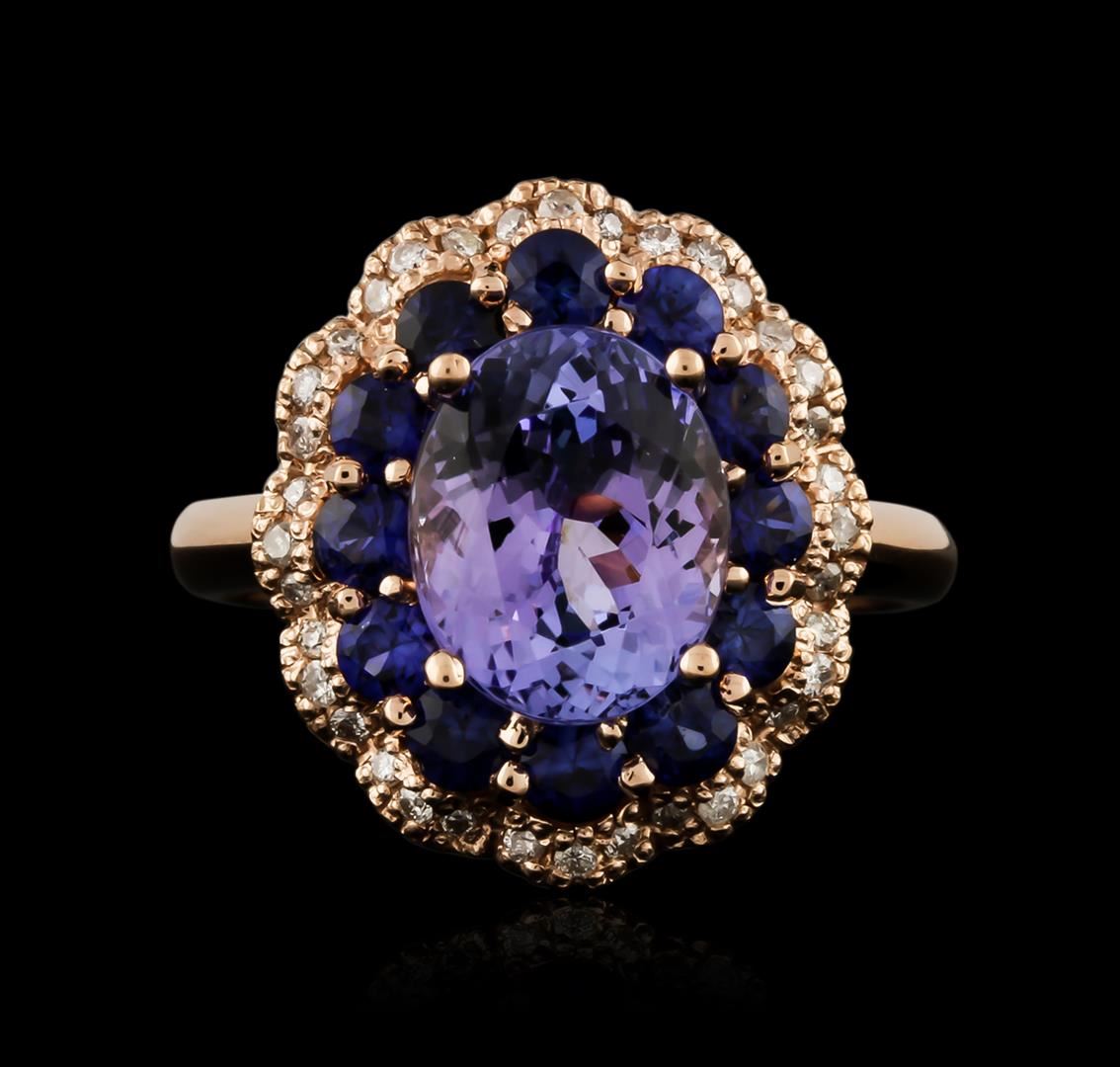 One electronically tested 14KT rose gold ladies cast tanzanite, sapphire and diamond ring with a bright polish finish. Identified with markings of "K14". Condition is new. Containing: One prong set oval modified brilliant cut natural tanzanite, measuring 9.90 x 8.00 x 5.20mm, approximate weight of 2.90ct., clarity is eye clean, type I, medium light, very slightly grayish, violet color, (GIA V 4/3), cut is good. Twelve prong set round modified brilliant cut natural blue sapphires, measuring 2.80 - 2.80 x 1.83 mm, approximate total weight of 1.32ct., clarity is slightly included, type II, medium, moderately strong, blue color, (GIA B 5/4), cut is good. Thirty-Nine prong set round brilliant cut diamonds, measuring 1.00 - 1.00 x 0.60mm (depth est.) approximate total weight of 39 Stones = 0.14ct. Clarity: I-2. Color: J - K, Cut is Good. Colored gemstones are presumed to have been subjected to commonly used enhancement processes. All diamonds and colored gemstones are graded in the mounting, unless otherwise stated. Total Weight of Colored Stones 4.22ct. Total Weight of Diamonds 0.14ct. Total Weight of Ring 6.90 grams. GGL Appraised at $3,730.00.