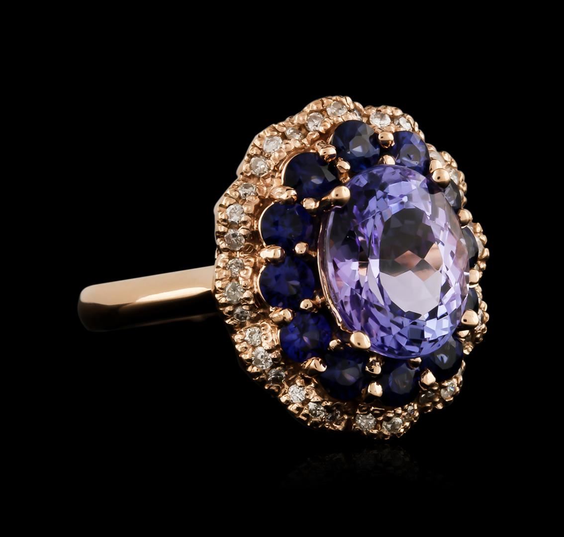 One electronically tested 14KT rose gold ladies cast tanzanite, sapphire and diamond ring with a bright polish finish. Identified with markings of "K14". Condition is new. Containing: One prong set oval modified brilliant cut natural tanzanite, measuring 9.90 x 8.00 x 5.20mm, approximate weight of 2.90ct., clarity is eye clean, type I, medium light, very slightly grayish, violet color, (GIA V 4/3), cut is good. Twelve prong set round modified brilliant cut natural blue sapphires, measuring 2.80 - 2.80 x 1.83 mm, approximate total weight of 1.32ct., clarity is slightly included, type II, medium, moderately strong, blue color, (GIA B 5/4), cut is good. Thirty-Nine prong set round brilliant cut diamonds, measuring 1.00 - 1.00 x 0.60mm (depth est.) approximate total weight of 39 Stones = 0.14ct. Clarity: I-2. Color: J - K, Cut is Good. Colored gemstones are presumed to have been subjected to commonly used enhancement processes. All diamonds and colored gemstones are graded in the mounting, unless otherwise stated. Total Weight of Colored Stones 4.22ct. Total Weight of Diamonds 0.14ct. Total Weight of Ring 6.90 grams. GGL Appraised at $3,730.00.