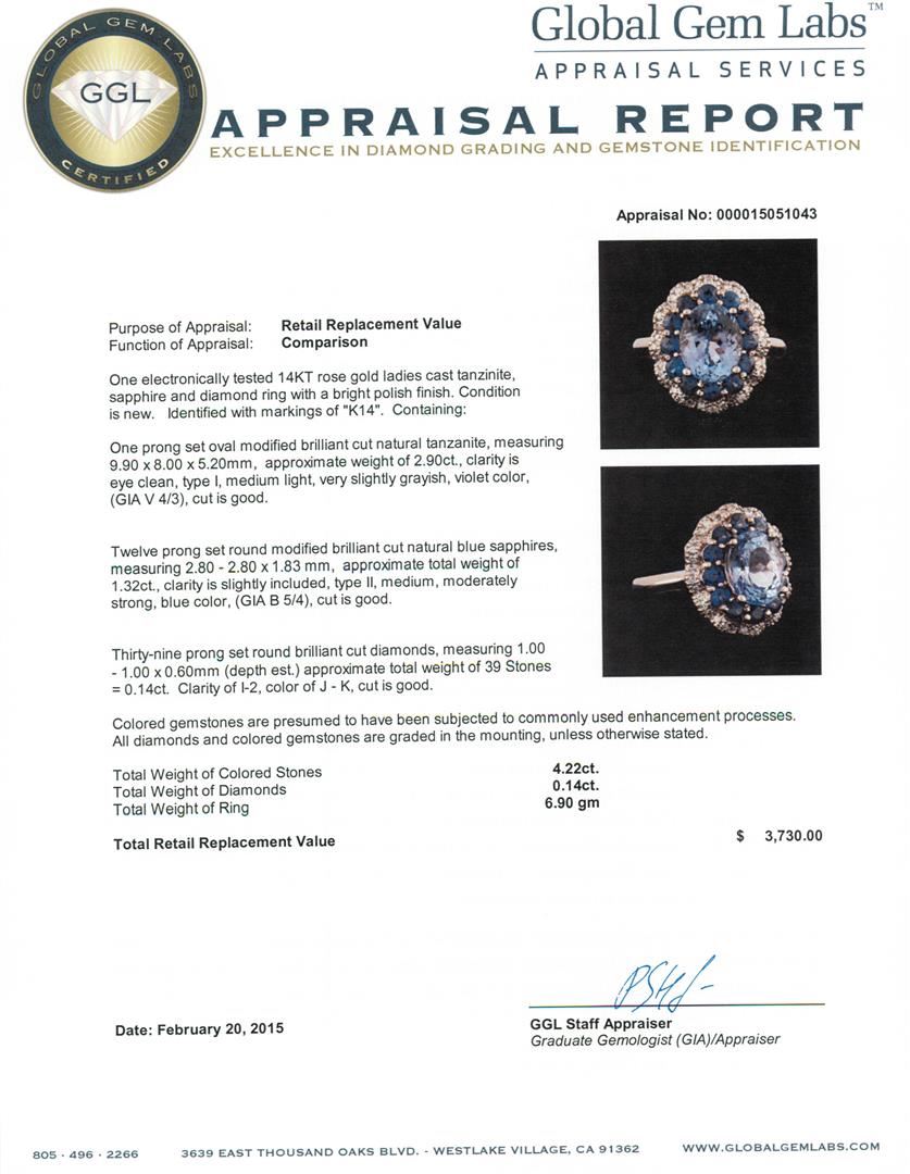 One electronically tested 14KT rose gold ladies cast tanzanite, sapphire and diamond ring with a bright polish finish. Identified with markings of "K14". Condition is new. Containing: One prong set oval modified brilliant cut natural tanzanite, measuring 9.90 x 8.00 x 5.20mm, approximate weight of 2.90ct., clarity is eye clean, type I, medium light, very slightly grayish, violet color, (GIA V 4/3), cut is good. Twelve prong set round modified brilliant cut natural blue sapphires, measuring 2.80 - 2.80 x 1.83 mm, approximate total weight of 1.32ct., clarity is slightly included, type II, medium, moderately strong, blue color, (GIA B 5/4), cut is good. Thirty-Nine prong set round brilliant cut diamonds, measuring 1.00 - 1.00 x 0.60mm (depth est.) approximate total weight of 39 Stones = 0.14ct. Clarity: I-2. Color: J - K, Cut is Good. Colored gemstones are presumed to have been subjected to commonly used enhancement processes. All diamonds and colored gemstones are graded in the mounting, unless otherwise stated. Total Weight of Colored Stones 4.22ct. Total Weight of Diamonds 0.14ct. Total Weight of Ring 6.90 grams. GGL Appraised at $3,730.00.