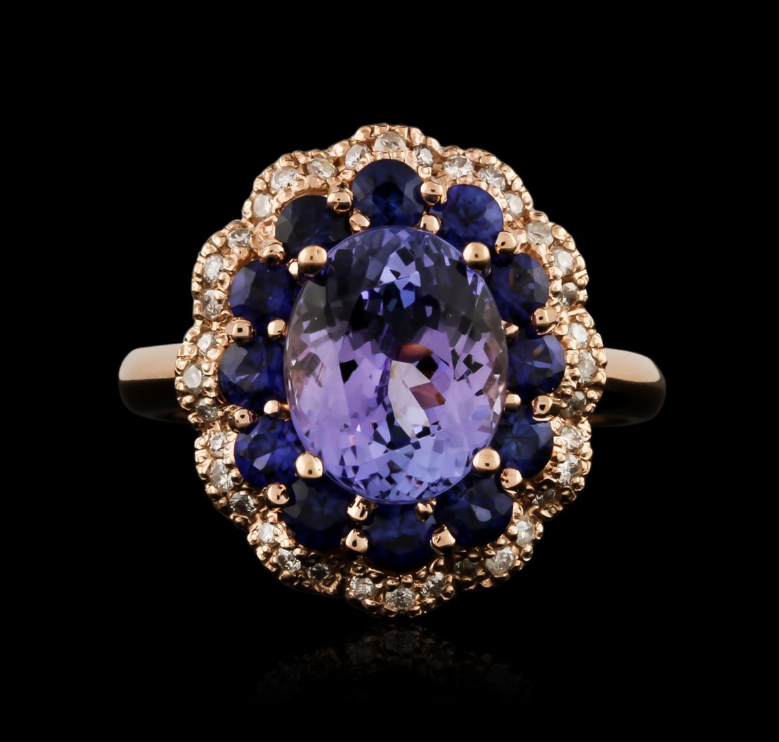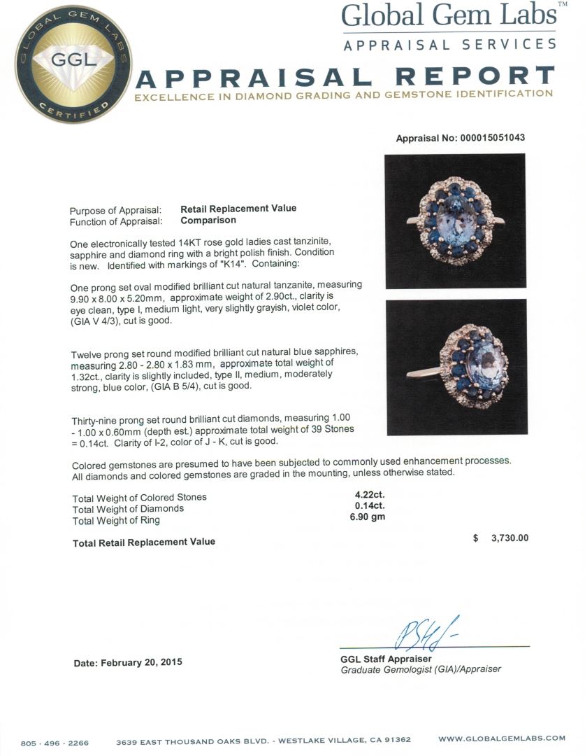 One electronically tested 14KT rose gold ladies cast tanzanite, sapphire and diamond ring with a bright polish finish. Identified with markings of "K14". Condition is new. Containing: One prong set oval modified brilliant cut natural tanzanite, measuring 9.90 x 8.00 x 5.20mm, approximate weight of 2.90ct., clarity is eye clean, type I, medium light, very slightly grayish, violet color, (GIA V 4/3), cut is good. Twelve prong set round modified brilliant cut natural blue sapphires, measuring 2.80 - 2.80 x 1.83 mm, approximate total weight of 1.32ct., clarity is slightly included, type II, medium, moderately strong, blue color, (GIA B 5/4), cut is good. Thirty-Nine prong set round brilliant cut diamonds, measuring 1.00 - 1.00 x 0.60mm (depth est.) approximate total weight of 39 Stones = 0.14ct. Clarity: I-2. Color: J - K, Cut is Good. Colored gemstones are presumed to have been subjected to commonly used enhancement processes. All diamonds and colored gemstones are graded in the mounting, unless otherwise stated. Total Weight of Colored Stones 4.22ct. Total Weight of Diamonds 0.14ct. Total Weight of Ring 6.90 grams. GGL Appraised at $3,730.00.