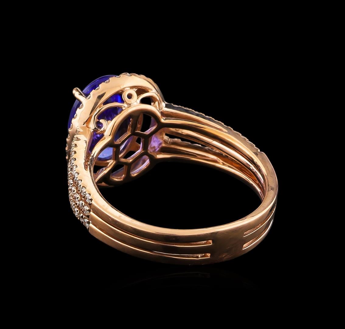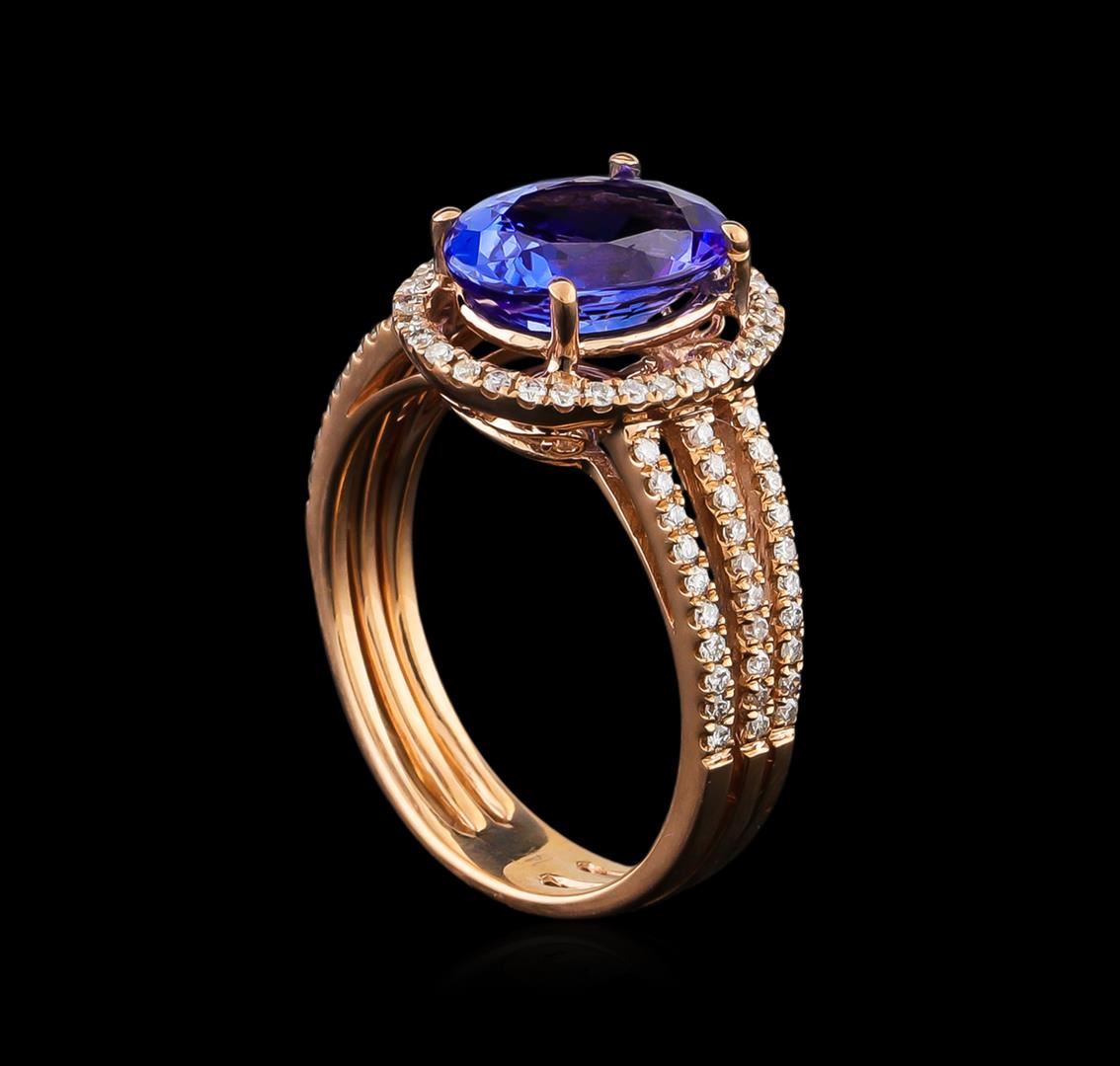 One electronically tested 14KT rose gold ladies combination cast & assembled tanzanite and diamond ring with a split shank with a bright polish finish. Identified with markings of "14K". Condition is new. Containing: One prong set oval modified brilliant cut natural tanzanite, measuring 10.48 x 7.91 x 5.16mm, approximate weight of 2.92ct., clarity is eye clean, type I, medium, moderately strong, violet color, (GIA V 5/4), cut is good. Ninety-Two prong set round brilliant cut diamonds, measuring 1.10 - 1.10 x 0.66mm (depth est.) approximate total weight of 92 Stones = 0.44ct. Clarity: I-1 to I-2. Color: I - J, Cut is Good. Colored gemstones are presumed to have been subjected to commonly used enhancement processes. All diamonds and colored gemstones are graded in the mounting, unless otherwise stated total weight of Colored Stones 2.92ct. Total Weight of Diamonds 0.44ct. Total Weight of Ring 4.80 grams. GGL Appraised at $6,785.00.